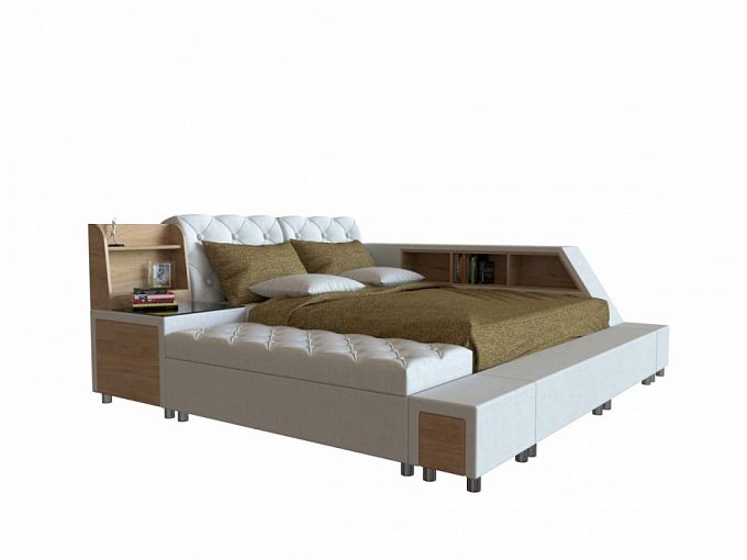 Современная кровать Софи Атланта BMS не только стильно выглядит, но и отличается необычайной функциональностью. Оригинальная конструкция этой модели предполагает наличие вместительных открытых полок вдоль боковин, а также мягких пуфов сбоку и в изножье кровати. Для комфортного сна кровать оборудована удобным, просторным спальным местом, а необходимые мелочи всегда будут под рукой. Обивка из мягкого светлого кожзама эффектна, проста в уходе и износоустойчива. Купить кровать Софи Атланта BMS вы сможете в нашем интернет-магазине по доступной цене.