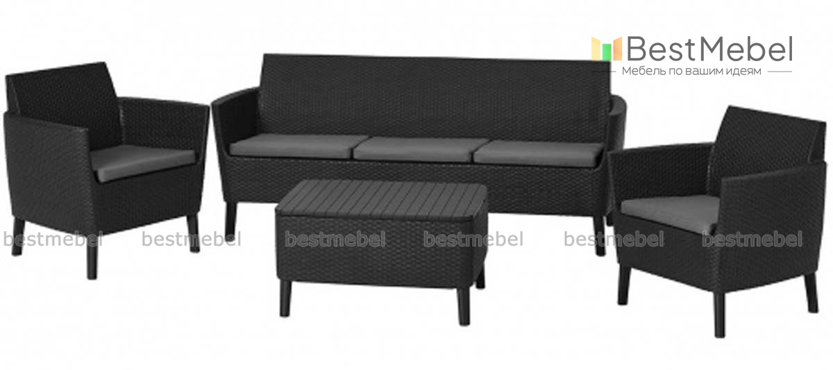 Комплект Salemo 3 seater set выполнен из прочного пластика и отличается эргономичным современным дизайном. Поверхности предметов, устойчивые к неблагоприятным погодным условиям, просты в уходе, не выгорают и не деформируются со временем. Комплект включает в себя все необходимое для комфортного отдыха в саду: два кресла 79х66.5х76 см, столик с отделением для хранения небольших вещей 76х56.5х41.5 см и трехместный диван 187х66.5х76 см. Купить комплект Salemo 3 seater set для оформления удобной и стильной зоны отдыха вы сможете в нашем интернет-магазине.