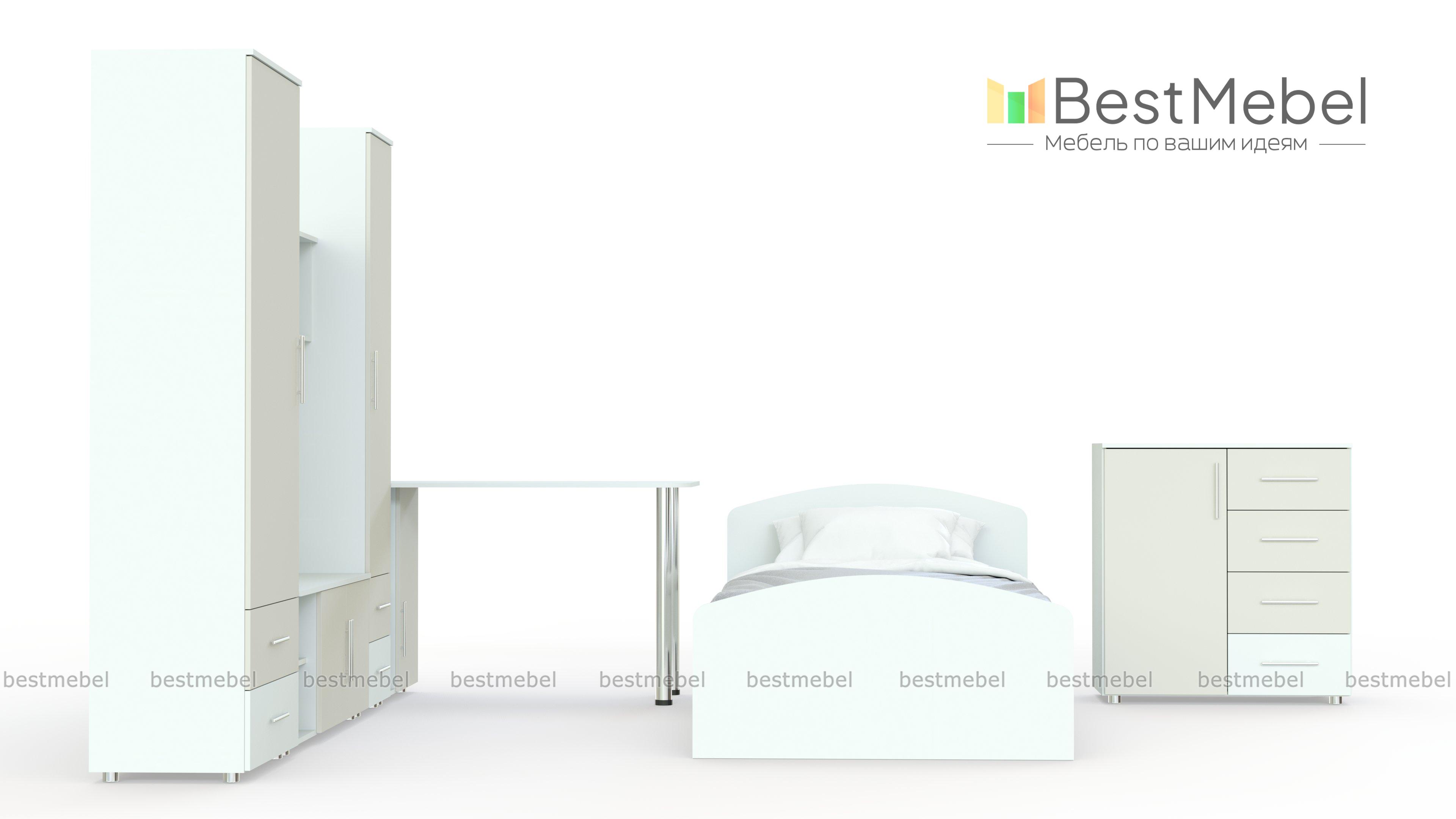 Детская комната Жасмин BMS привлекает ярким и функциональным дизайном. Модульная система объединила угловой стол с эргономично вырезанной столешницей, тумбой и надстройкой, комбинированные с выдвижными ящиками шкафы для одежды и секцию с тумбой под ТВ и навесной книжной полкой. Все предметы располагаются на высоких хромированных опорах и выполнены в сочетании универсального бело и светлых бежевых оттенков. Купить детскую комнату Жасмин BMS по доступной цене приглашаем в наш интернет-магазин.