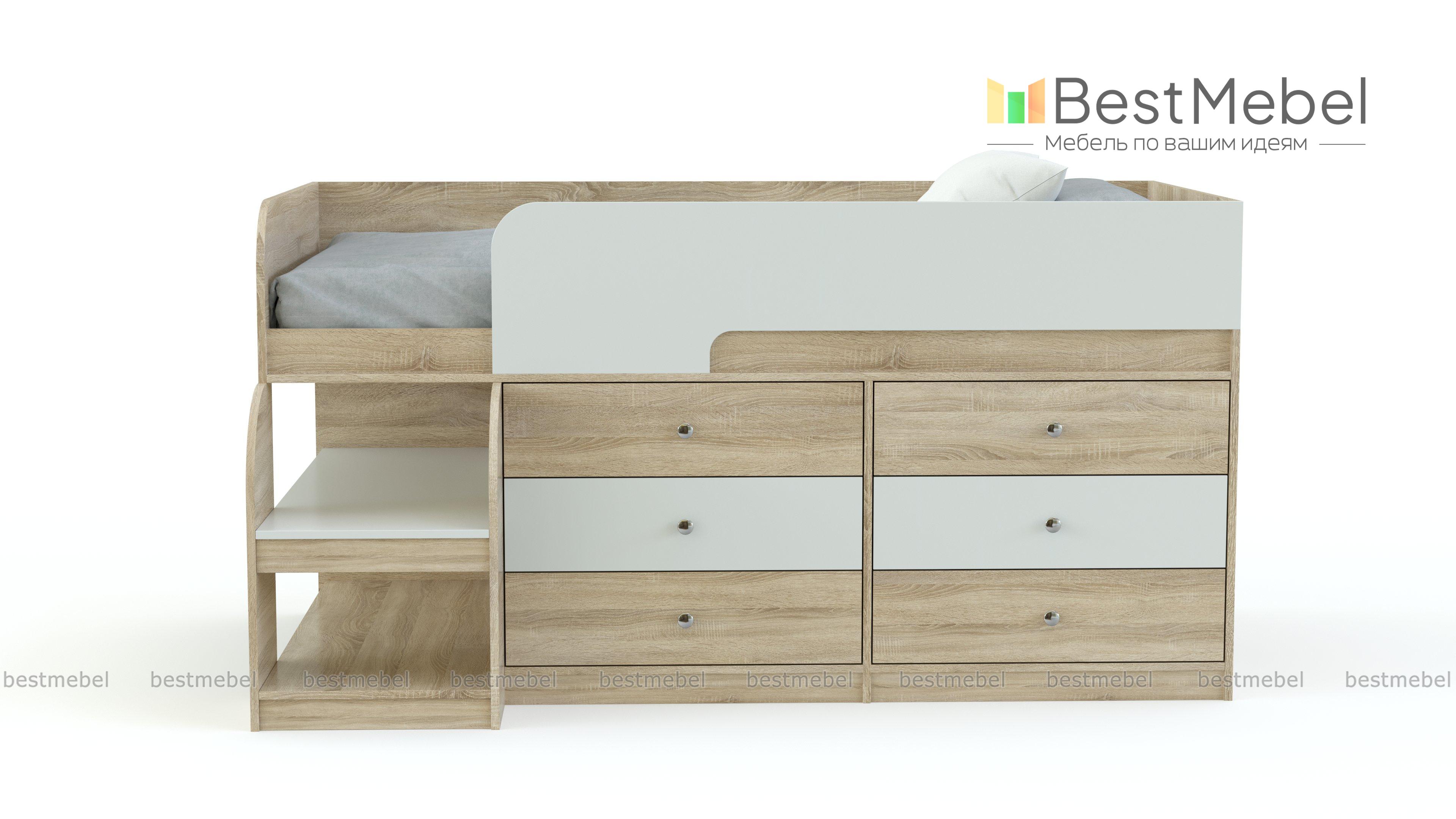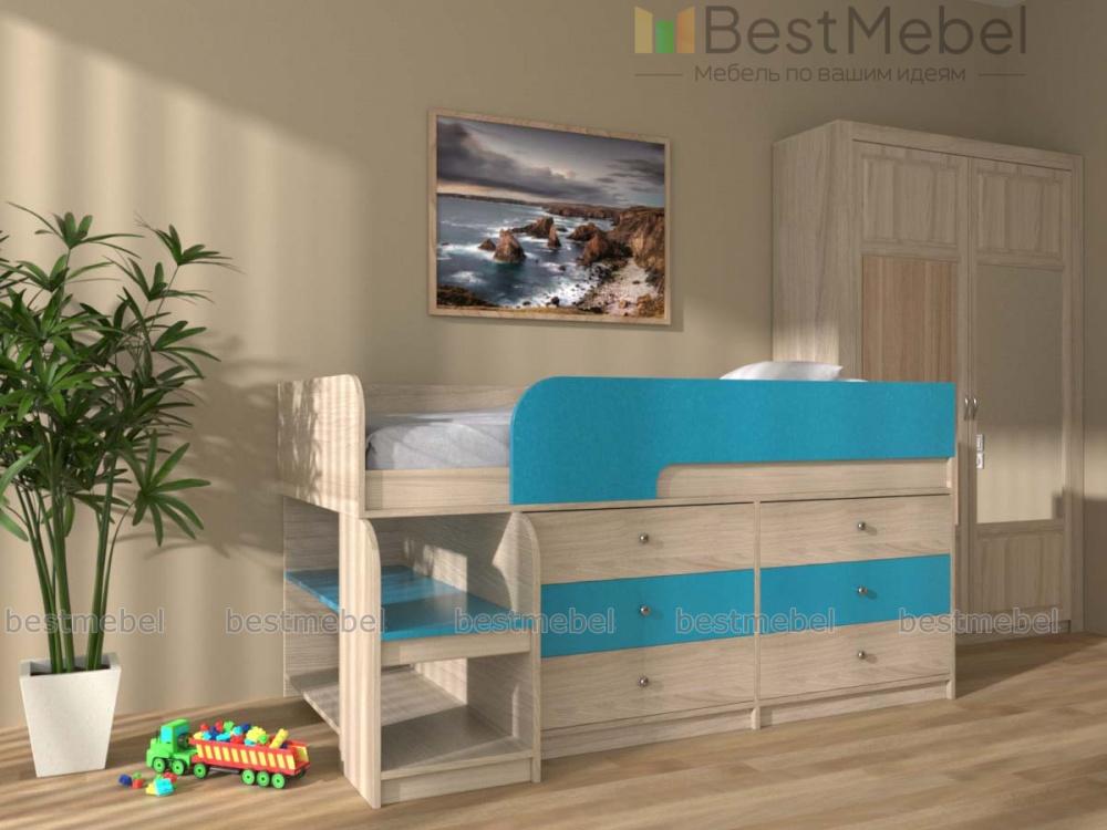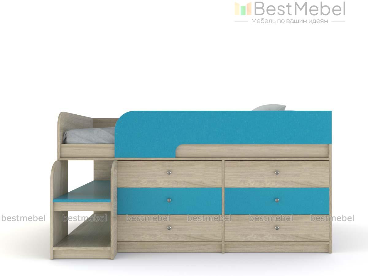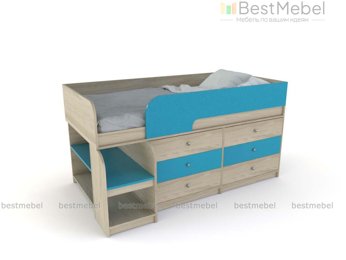 Кровать-чердак Маркиз 35 BMS – это практичный синтез спального места и системы хранения. Благодаря удачному проекту вы сэкономите пространство в комнате малыша. Чтобы забраться наверх, нужно воспользоваться прочной лестницей. Две широкие и глубокие ступени одновременно являются вариантом для расположения книг, вещей. Постель наверху – поэтому оборудована бортами. Под основанием размещены два блока: по три выдвижных ящика в каждом. Одежда и текстиль будут аккуратно разложены по полочкам. При заказе вы можете выбрать необходимый цвет ЛДСП.