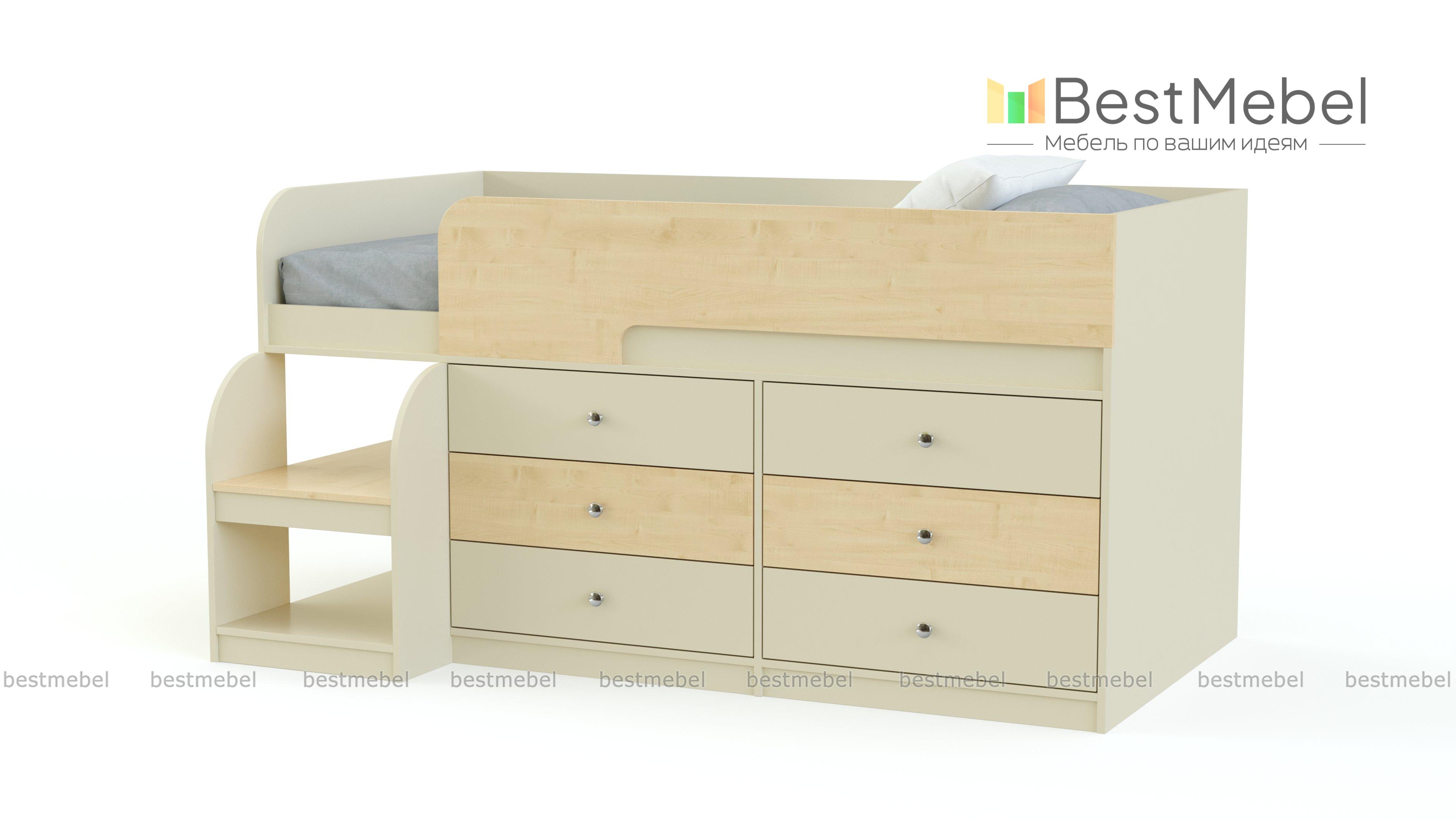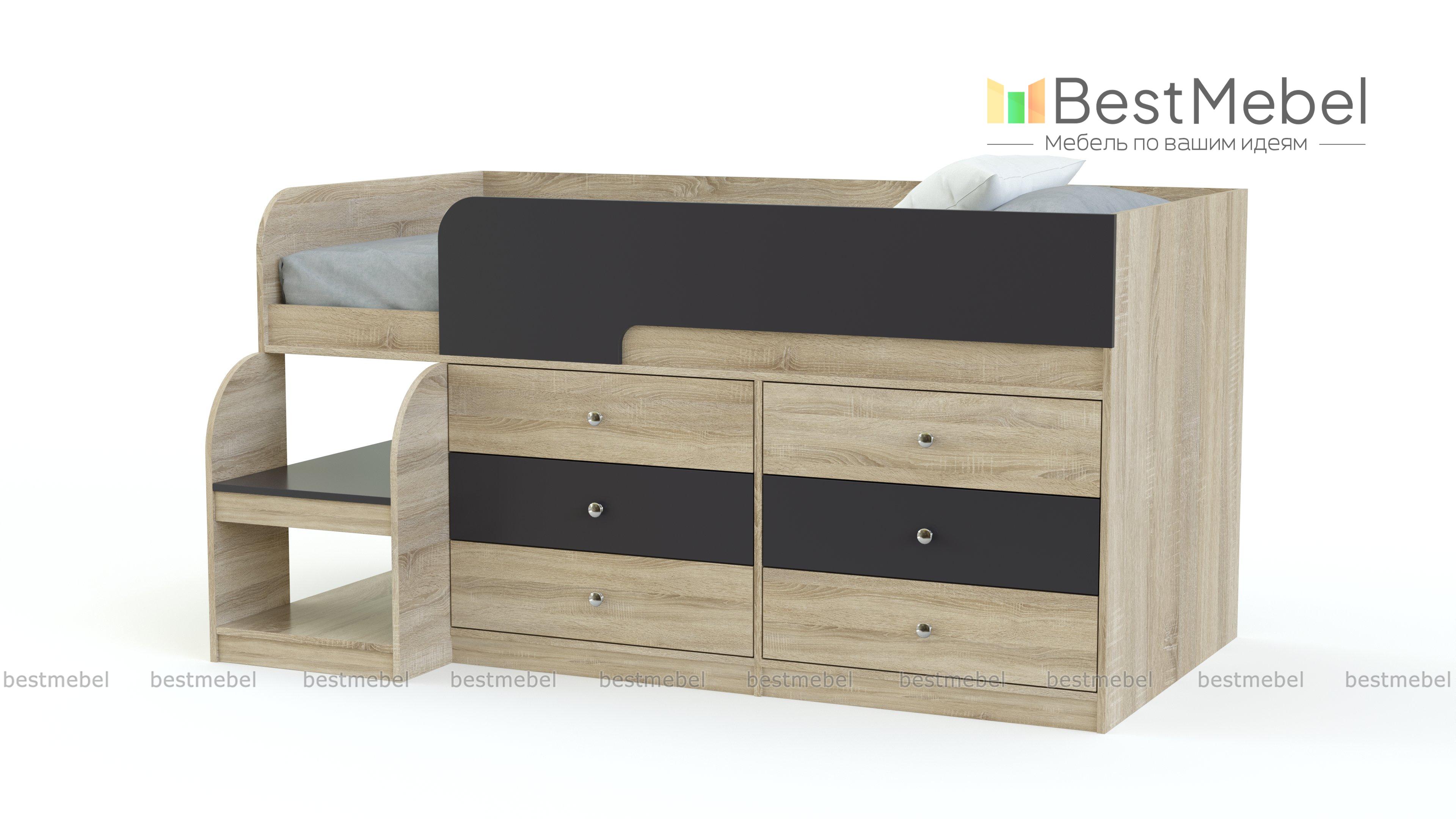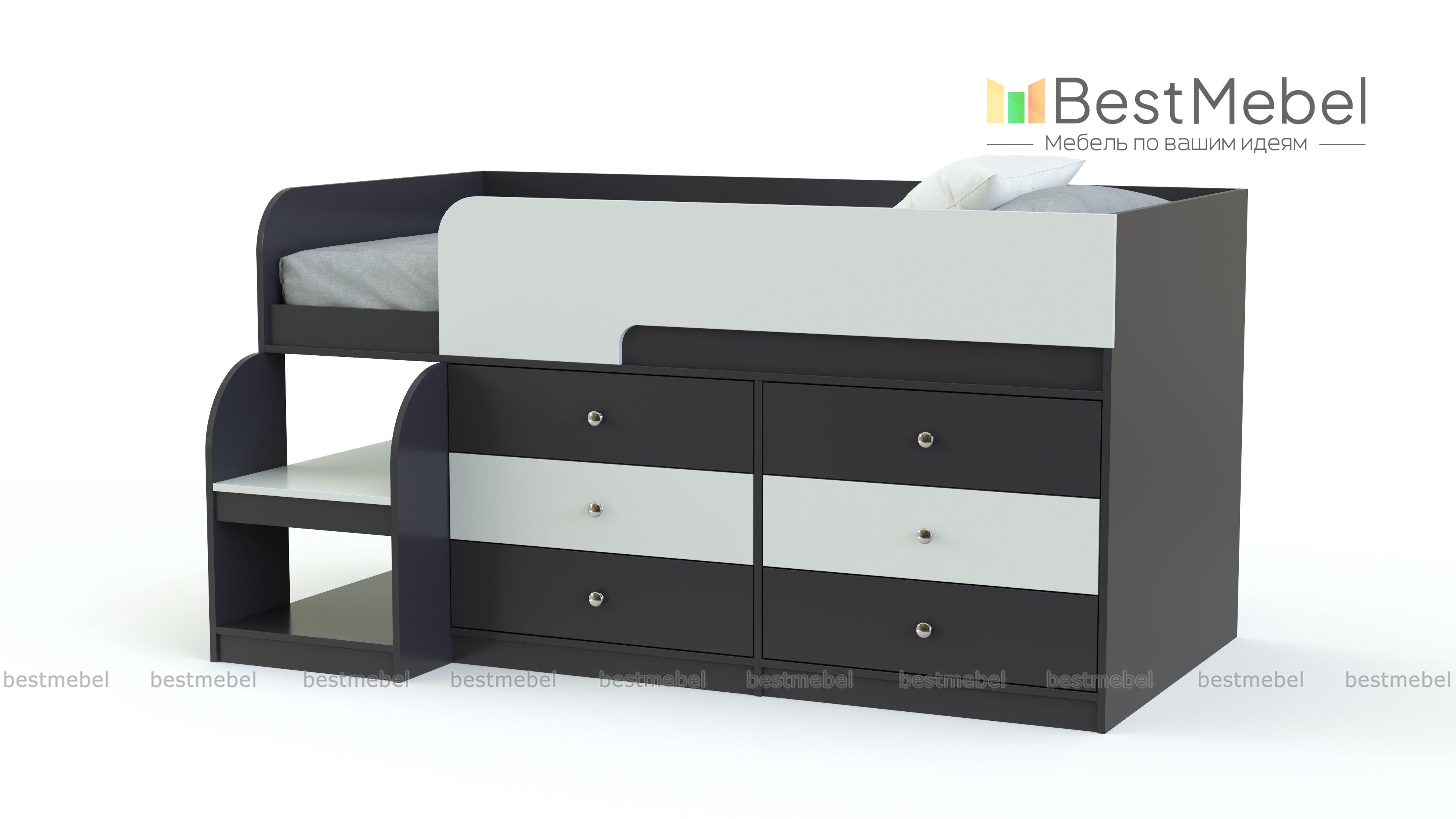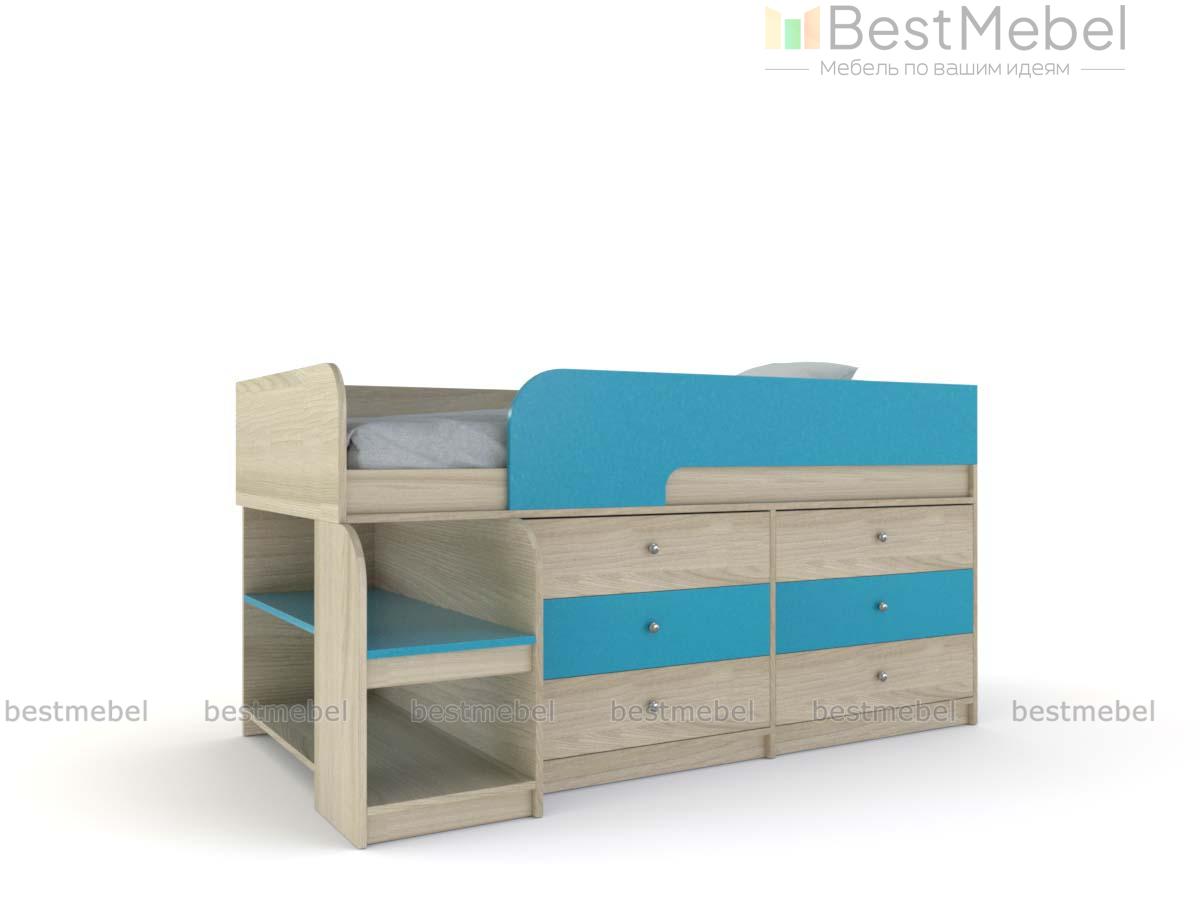 Кровать-чердак Маркиз 35 BMS – это практичный синтез спального места и системы хранения. Благодаря удачному проекту вы сэкономите пространство в комнате малыша. Чтобы забраться наверх, нужно воспользоваться прочной лестницей. Две широкие и глубокие ступени одновременно являются вариантом для расположения книг, вещей. Постель наверху – поэтому оборудована бортами. Под основанием размещены два блока: по три выдвижных ящика в каждом. Одежда и текстиль будут аккуратно разложены по полочкам. При заказе вы можете выбрать необходимый цвет ЛДСП.