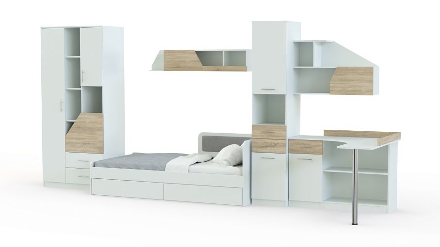 Модульная детская Колледж BMS – экономичное и стильное решение для молодежной комнаты. Современный комплект в нейтральных тонах не занимает много места, но при этом оборудован всем необходимым для комфортной учебы и отдыха. Необычная деталь – скошенные фасады ящиков и защитные бортики древесного оттенка. В набор входят софа, пенал, две навесные полки, комбинированный с открытыми полками, распашными отделениями и выдвижными ящиками шкаф и угловой компьютерный столик. Купить модульную детскую Колледж BMS вы сможете в нашем интернет-магазине.