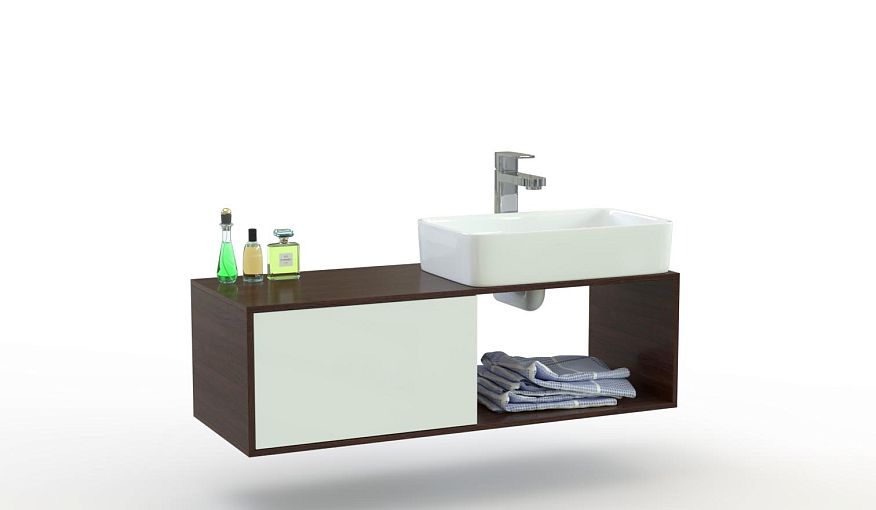 Тумба для ванной Женева 5 BMS поможет вам создать дизайнерский интерьер, отвечающий последним мебельным тенденциям. Широкая подвесная модель под накладную раковину-чашу эффектно смотрится в сочетании темного и эффектного белого цветов. Легкая прямоугольная тумба с просторной столешницей оборудована выдвижным ящиком и открытой секцией для хранения уходовых средств и разнообразных аксессуаров. Купить тумбу для ванной Женева 5 BMS приглашаем на сайт нашего интернет-магазина.
