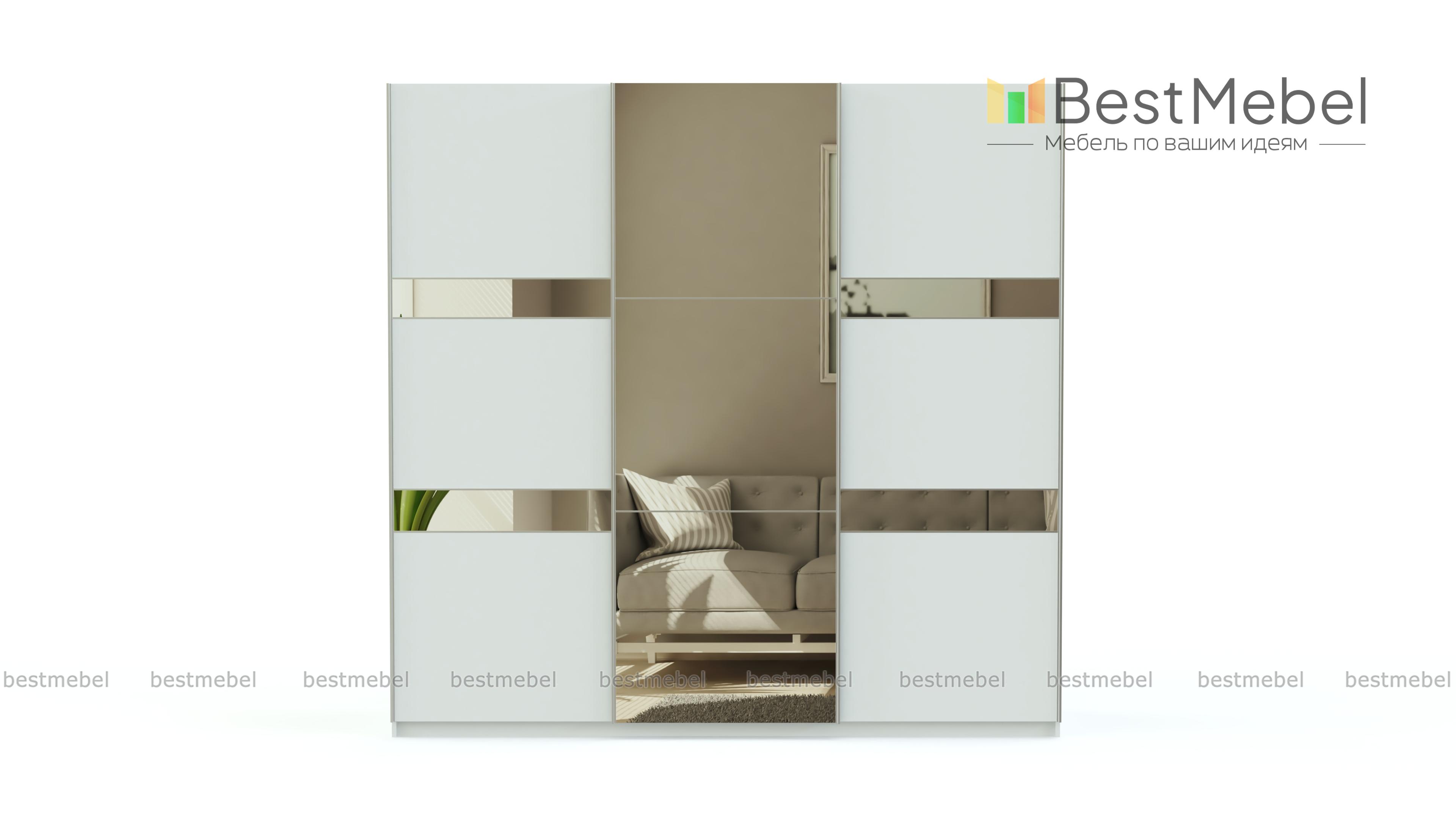 Современный шкаф-купе с оригинальным дизайном. Трехдверный фасад с горизонтальным делением выделен контрастными цветами и зеркалами. Такой шкаф будет одинаково хорошо смотреться в гостиной и прихожей. Конструкция предусматривает наличие вместительных полок, отделений со штангами и 4 выдвижных ящиков для хранения мелких вещей. Здесь найдется место для верхней одежды, платьев и сорочек, постельного белья, дорожных сумок, коробов, зонтов и многого другого, что часто загромождает углы квартиры.
