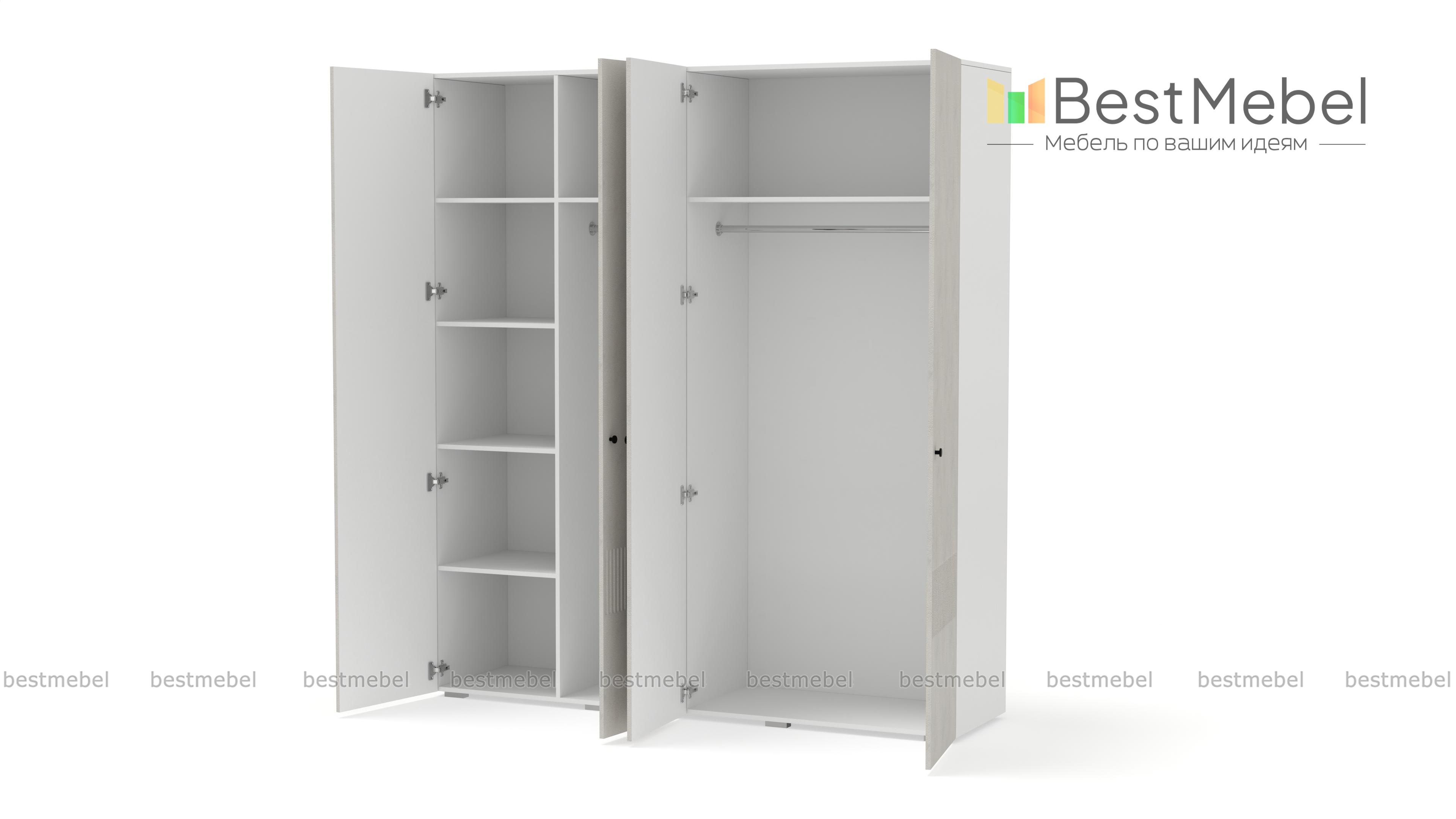 Шкаф распашной Джосс 4 BMS — практичная и стильная четырехдверная модель в прихожую, детскую или спальню. Два отделения со штангами и ряд полок слева помогут вам расположить вещи по категориям — от верхней одежды до трикотажа. Акцентный цветной фасад гардероба украшает фрезеровка, на дверцах установлены миниатюрные круглые ручки. Купить шкаф распашной Джосс 4 BMS вы сможете в нашем интернет-магазине, изменив по желанию размеры, тип ручек и цветовую гамму.