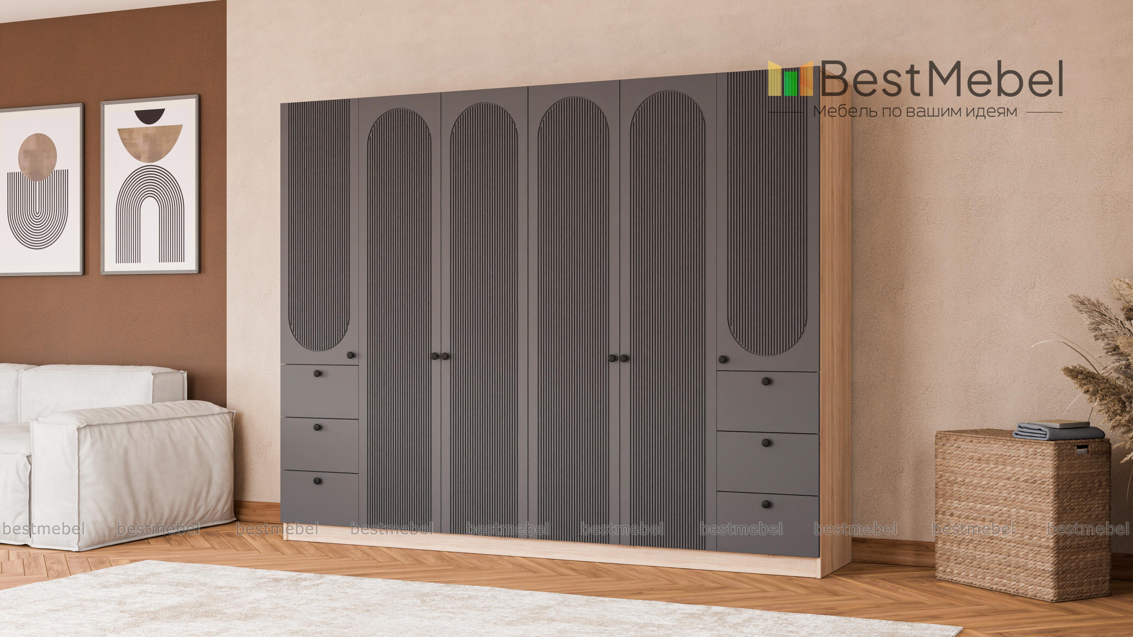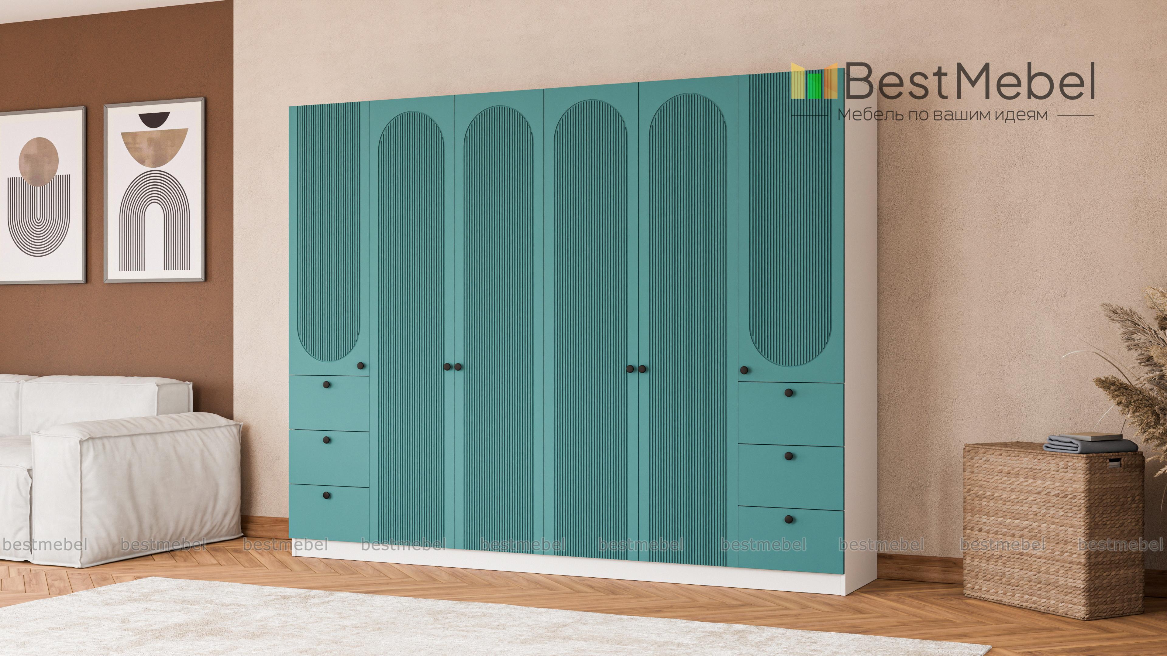 Шкаф распашной Рене 33 BMS объединил два платяных отделения в центре и две расположенные по бокам однодверные секции с ящиками. Большое количество мест для хранения позволяет компактно разместить гардероб, мелкие аксессуары и постельные принадлежности. Фасад шкафа украшен геометричным рельефом, на дверцы и ящики установлены удобные круглые ручки. Купить шкаф распашной Рене 33 BMS, изготовленный по индивидуальным размерам, вы сможете на сайте нашего интернет-магазина.