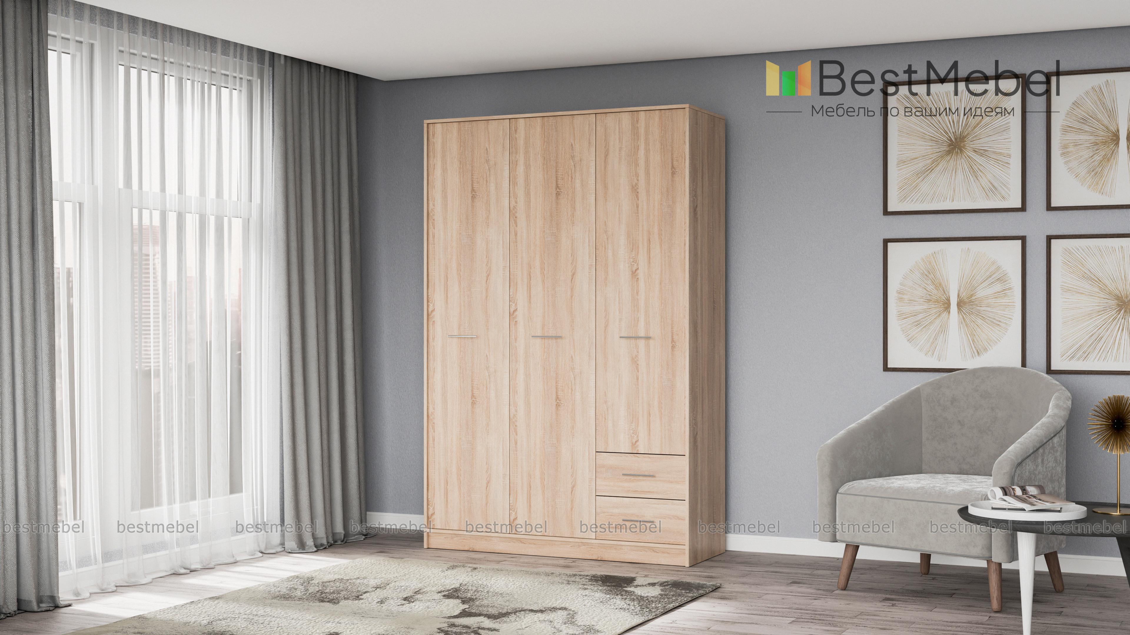 Шкаф Астарта 3 BMS – вместительная трехдверная модель универсального дизайна, который легко вписать в большинство современных интерьеров. Светлые оттенки под массив дуба будут гармонично смотреться в спальне, гостиной или прихожей. За двумя распашными дверцами располагается просторное отделение со штангой и полкой, в однодверной секции – также штанга и верхняя полка. Мелкие вещи удобно разместятся в двух выдвижных ящиках. Купить Шкаф Астарта 3 BMS, подобрав оптимальный вариант расцветки, вы сможете в нашем интернет-магазине.