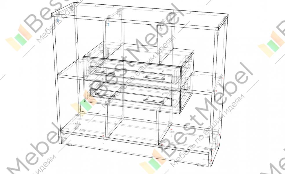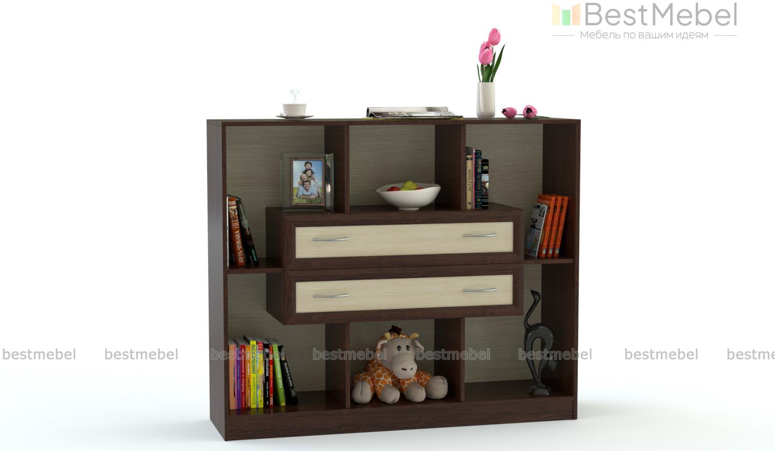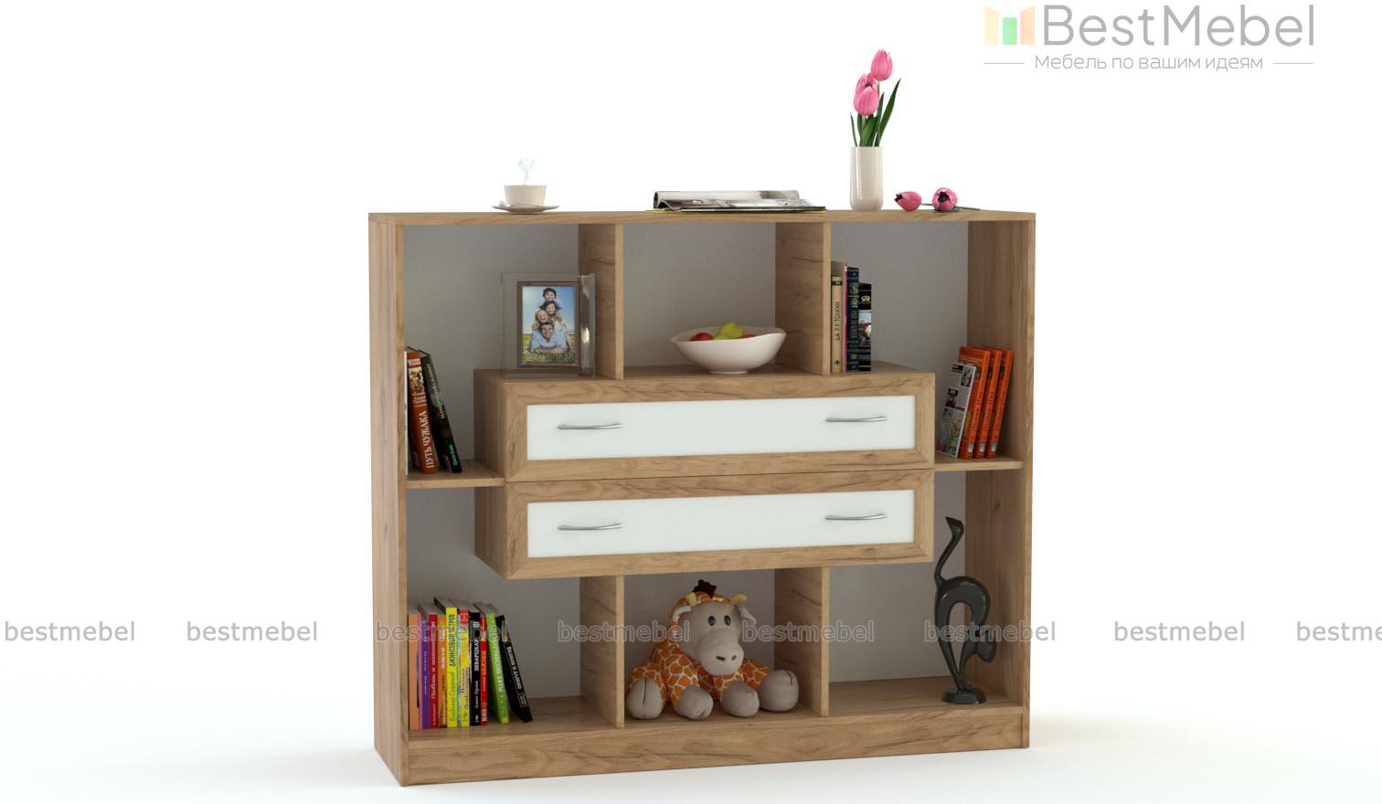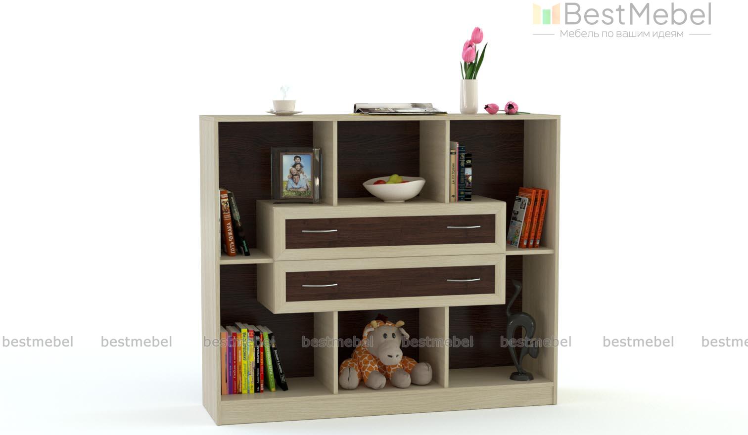 Стеллаж Берти 7 BMS с открытыми секциями и двумя выдвижными ящиками, расположенными по центру, дополнит интерьер гостиной или спальни. Широкий низкий стеллаж сможет оформить зону ТВ, разместит книги, декоративные предметы, которые сделают комнату уютнее, и множество мелочей. Модель с классическими рамочными фасадами выполняется в древесных оттенках на выбор. Купить стеллаж Берти 7 BMS приглашаем в наш интернет-магазин, подобрав фурнитуру и цветовое решение.