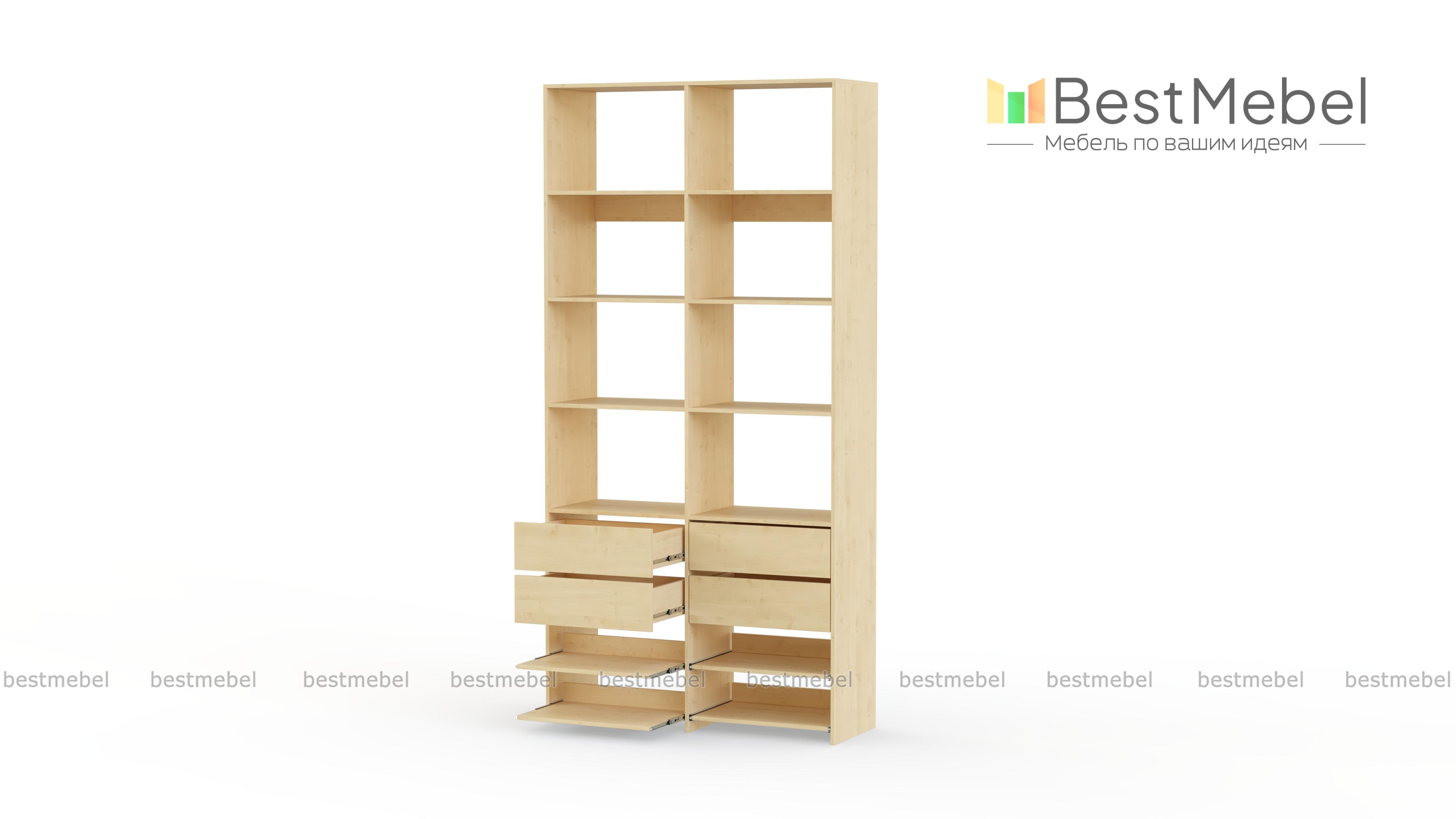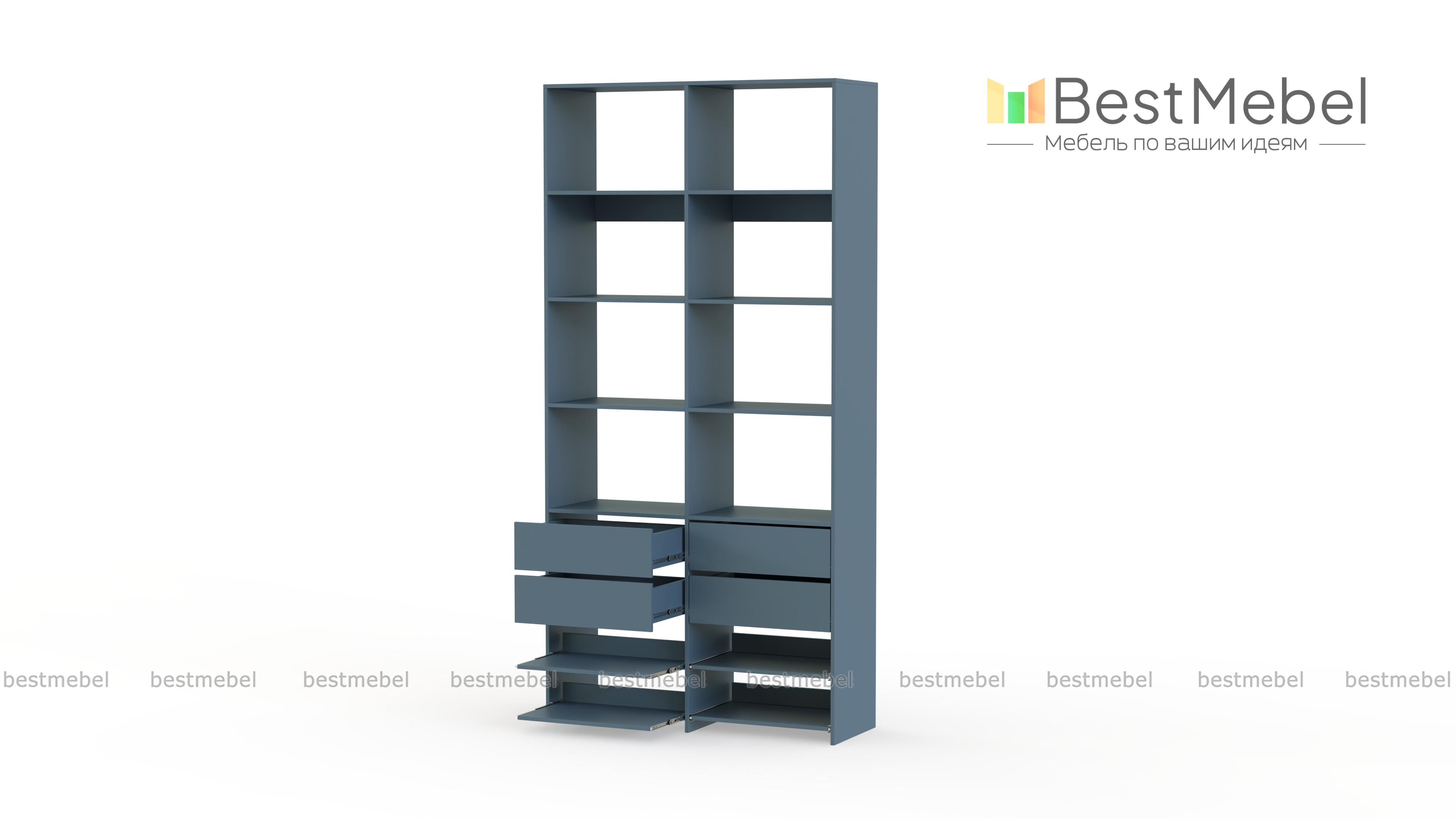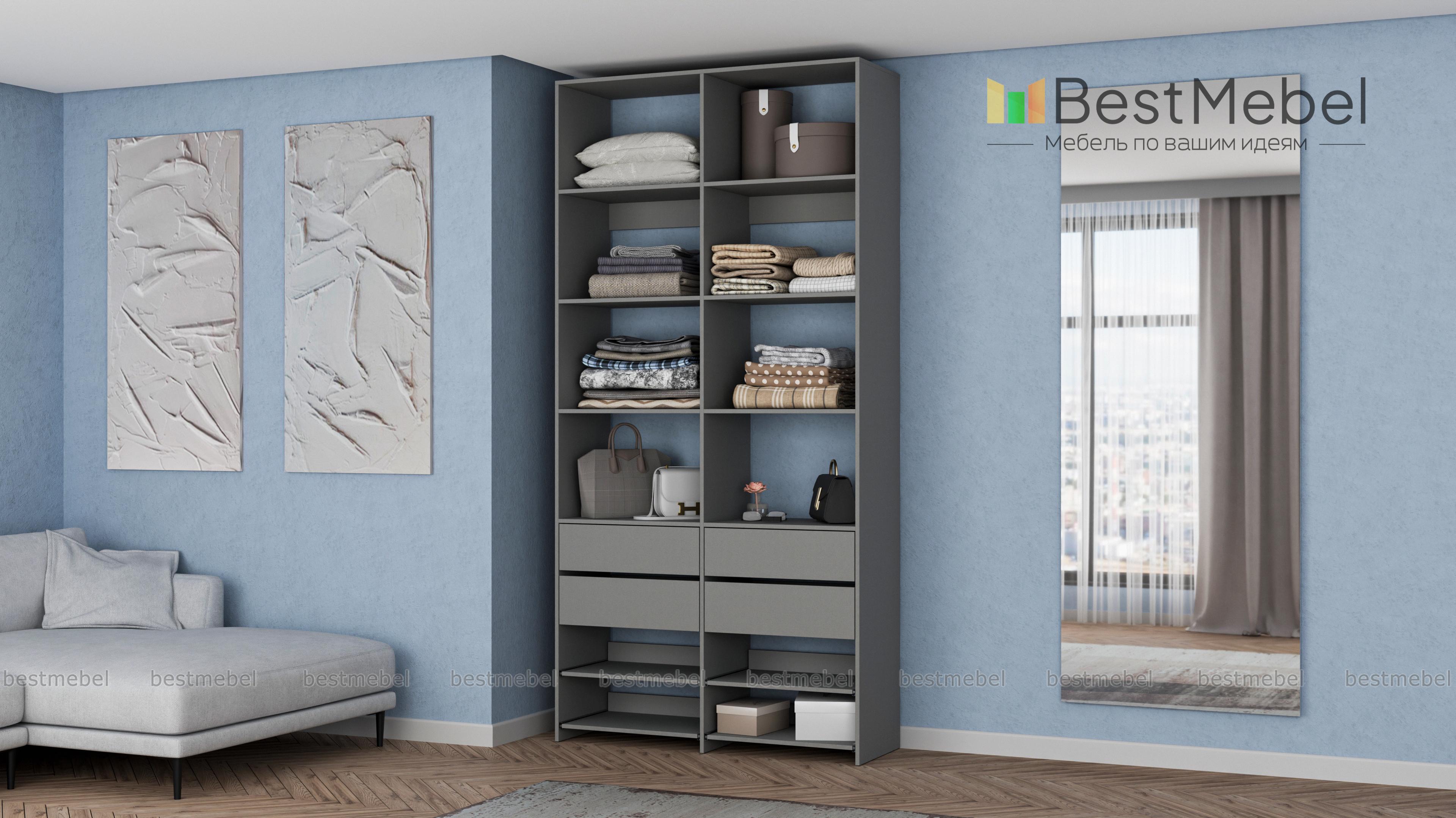 Стеллаж для одежды Мирта 85 BMS компактен и подходит для небольших помещений: прихожих, спален и гардеробных. Верхнюю часть конструкции занимают вместительные открытые секции, а нижнюю — четыре выдвижных ящика для белья и мелочей и удобные полки на направляющих. Продуманная компоновка позволит вам хранить как одежду и аксессуары, так и обувь. Купить стеллаж для одежды Мирта 85 BMS с самостоятельным подбором цвета и размеров вы сможете в нашем интернет-магазине.