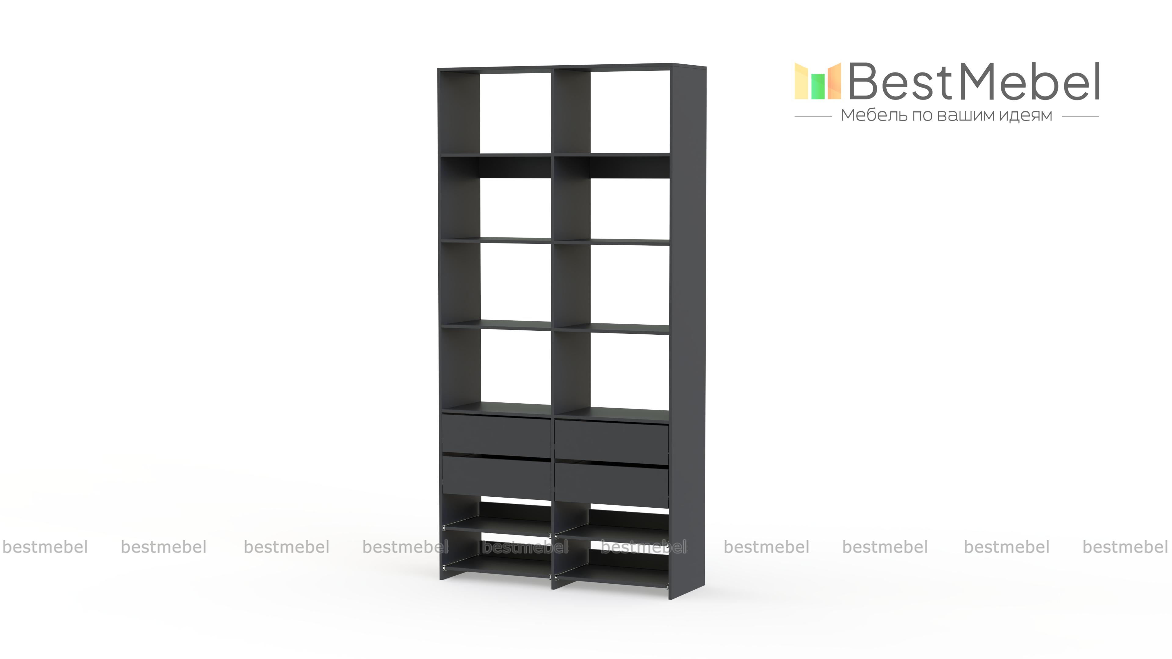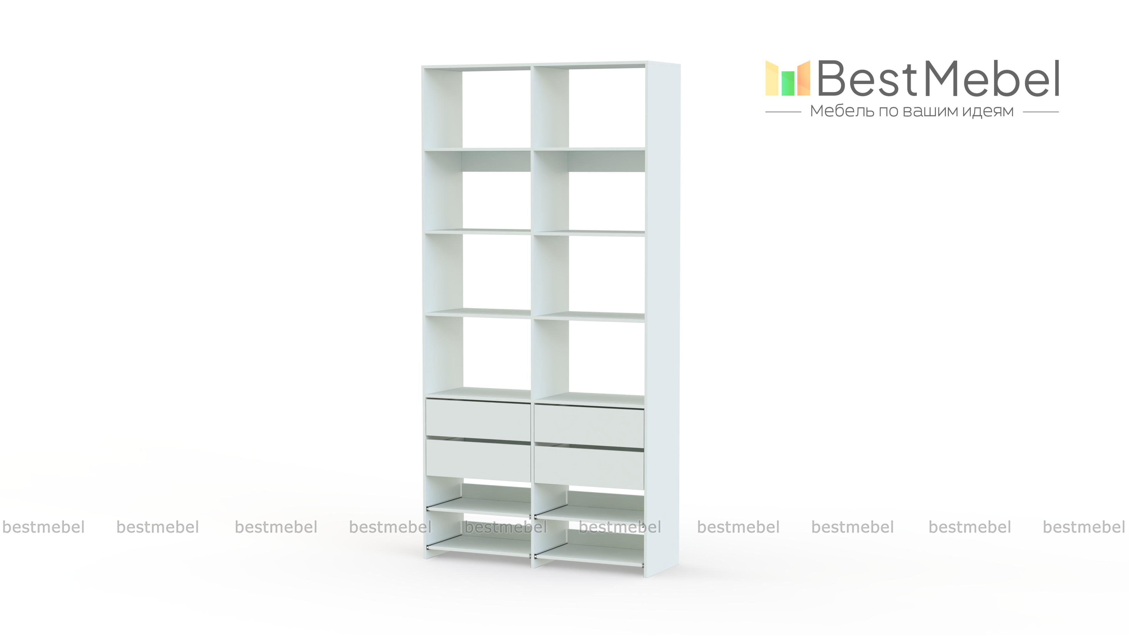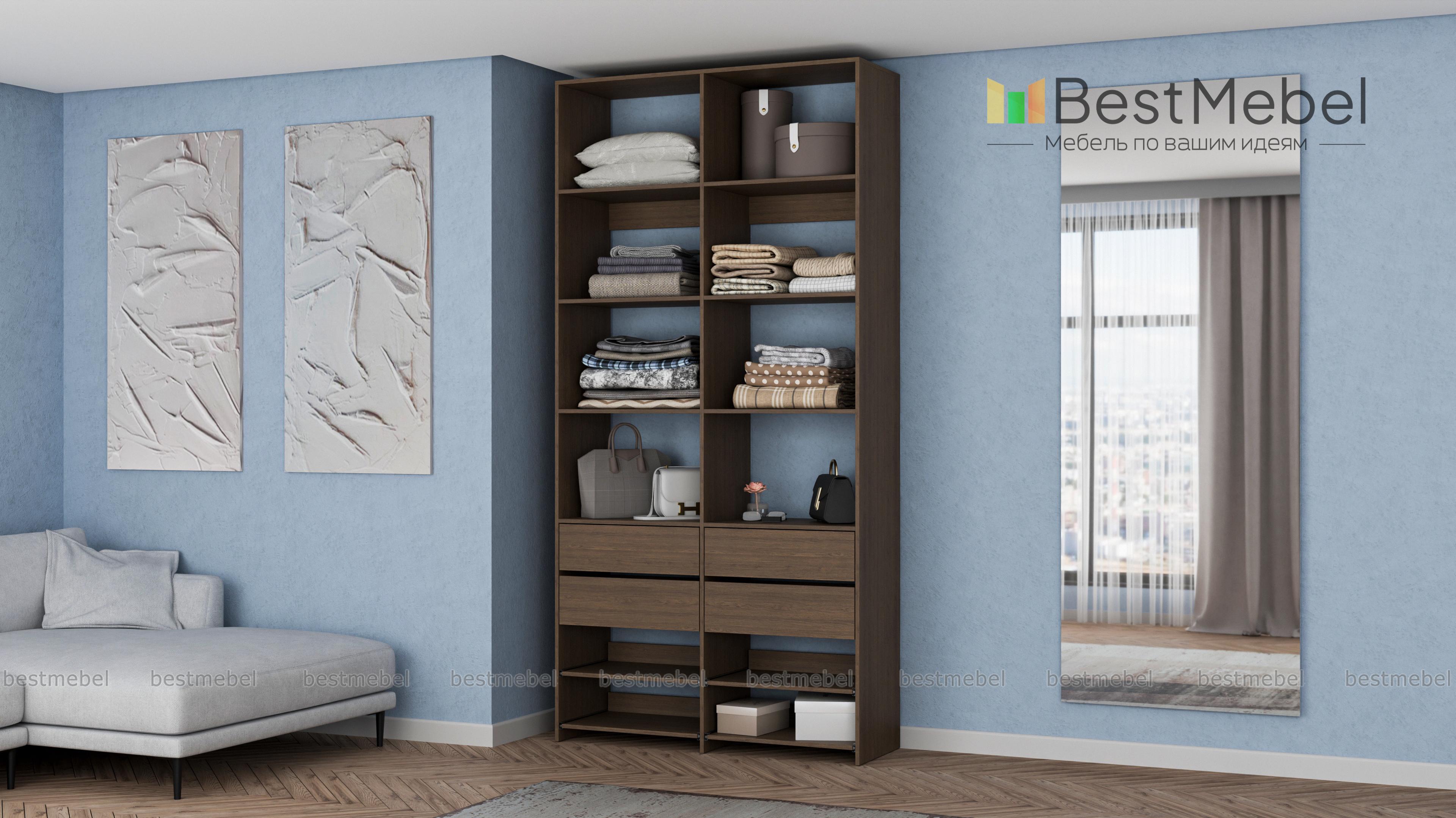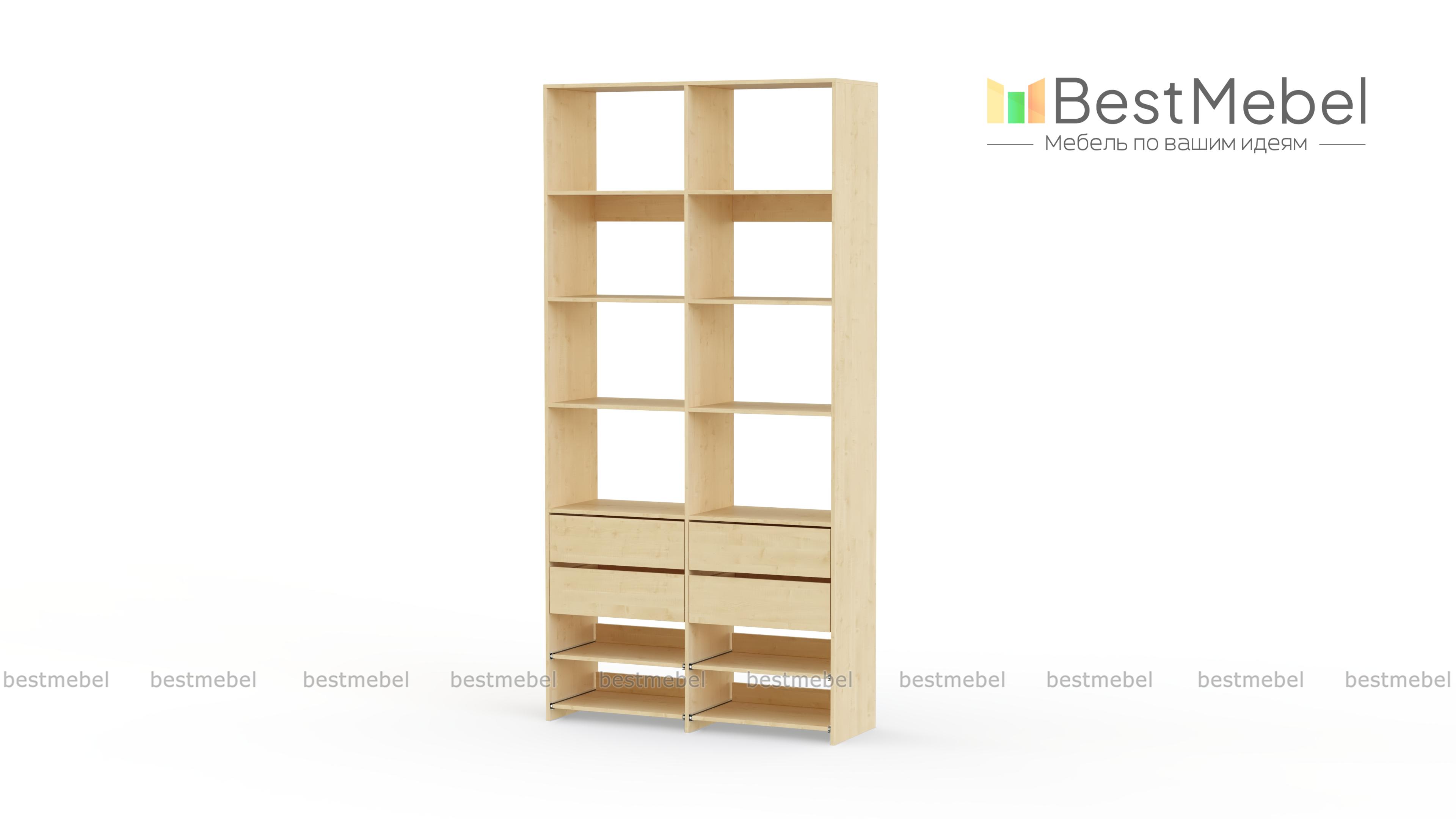 Стеллаж для одежды Мирта 85 BMS компактен и подходит для небольших помещений: прихожих, спален и гардеробных. Верхнюю часть конструкции занимают вместительные открытые секции, а нижнюю — четыре выдвижных ящика для белья и мелочей и удобные полки на направляющих. Продуманная компоновка позволит вам хранить как одежду и аксессуары, так и обувь. Купить стеллаж для одежды Мирта 85 BMS с самостоятельным подбором цвета и размеров вы сможете в нашем интернет-магазине.
