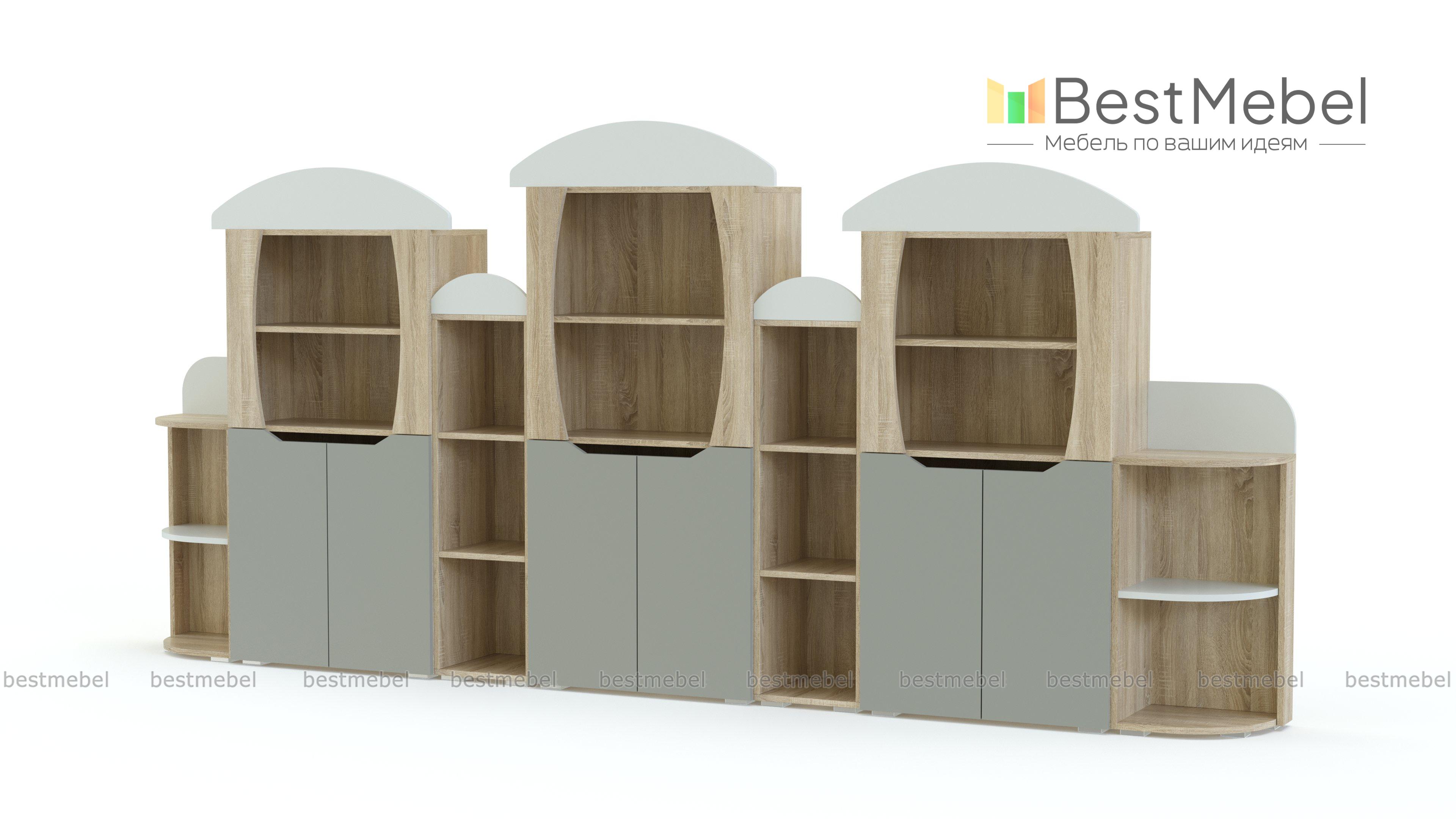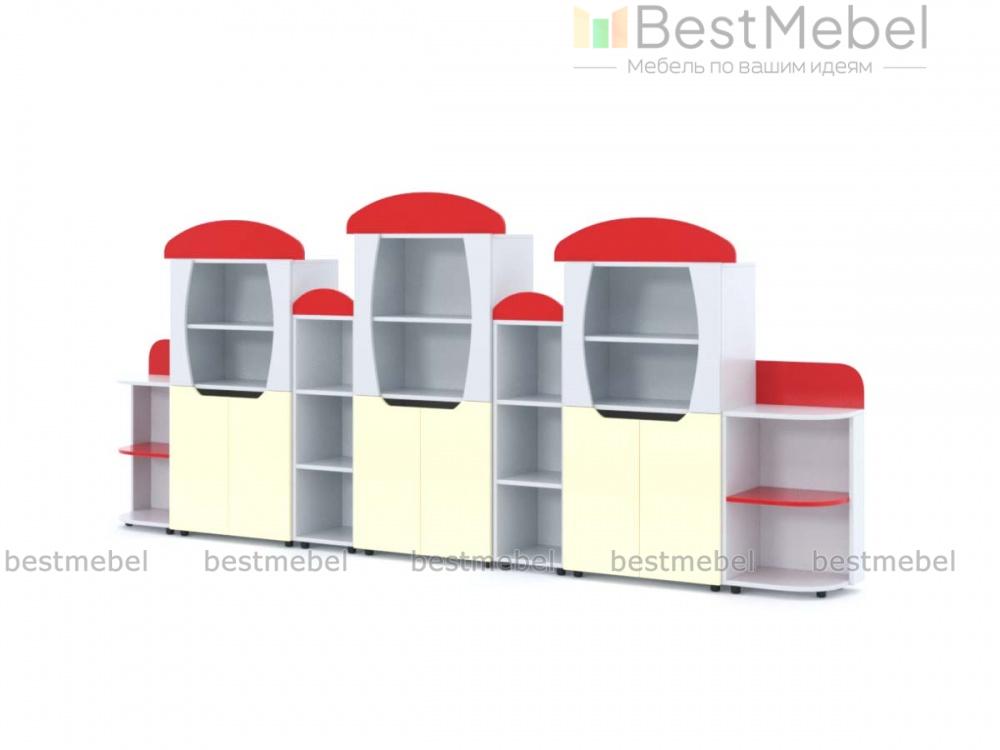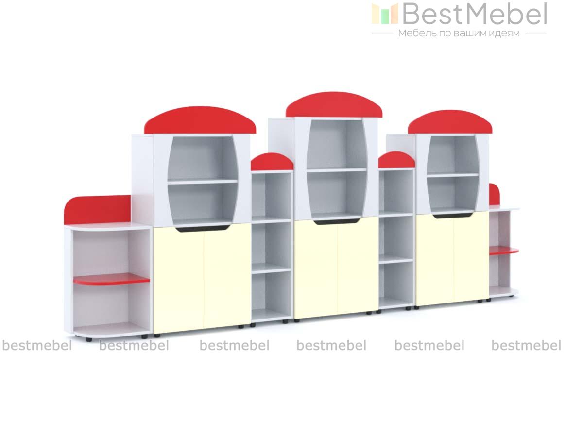 Стеллаж Вираж 4 BMS привлечет внимание детей красочным оформлением и разместит в удобном доступе книги, игрушки и учебные пособия. Стенка с фигурно вырезанными в форме грибков элементами оборудована просторными открытыми полками и тремя двухдверными распашными отделениями с глухими фасадами. Скругленные углы и безопасные ручки-вырезы помогут избежать случайных травм, а залогом долговечности станут износостойкие ламинированные поверхности. Купить стеллаж Вираж 4 BMS для меблировки детского сада вы всегда сможете в нашем интернет-магазине.