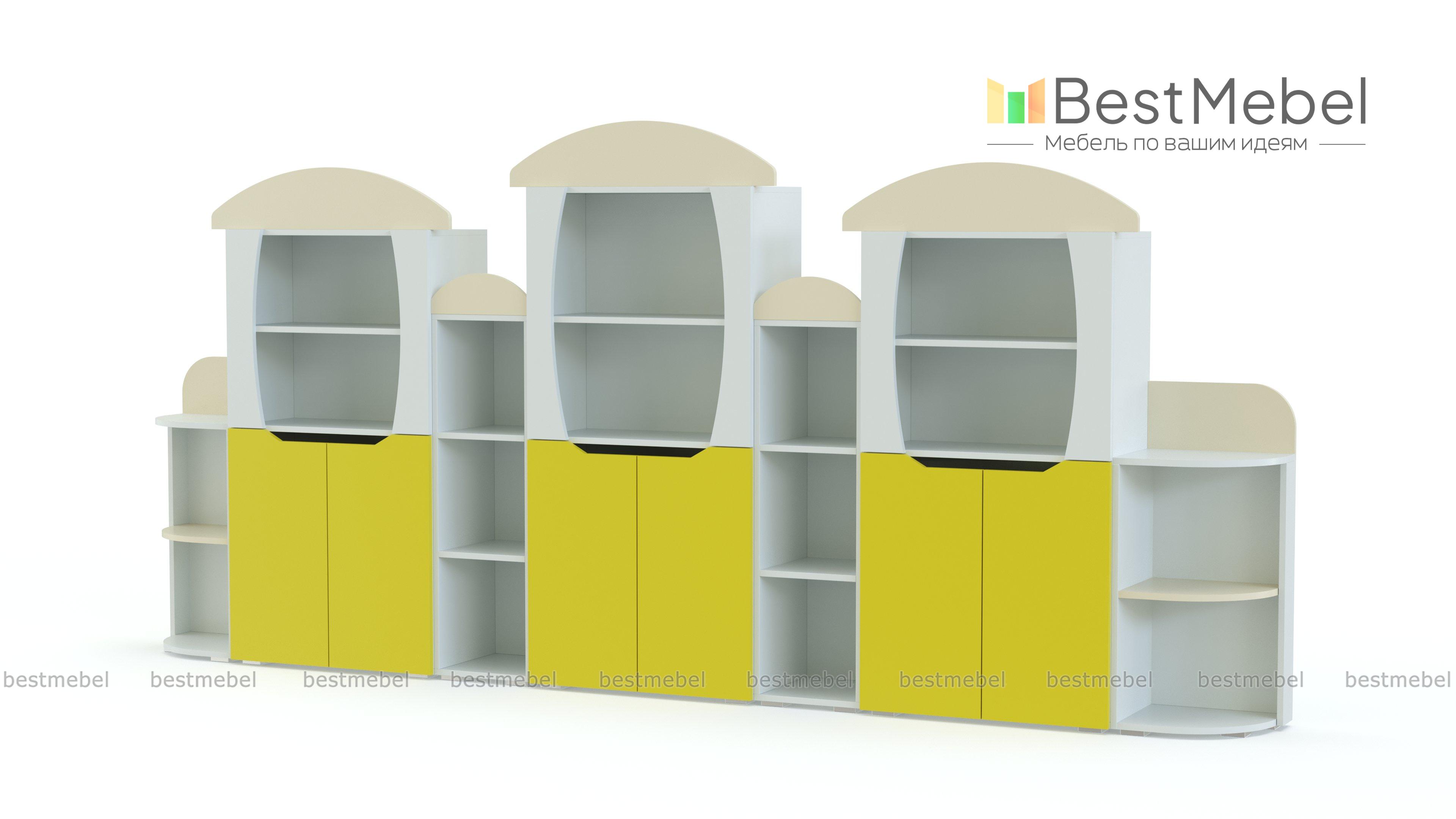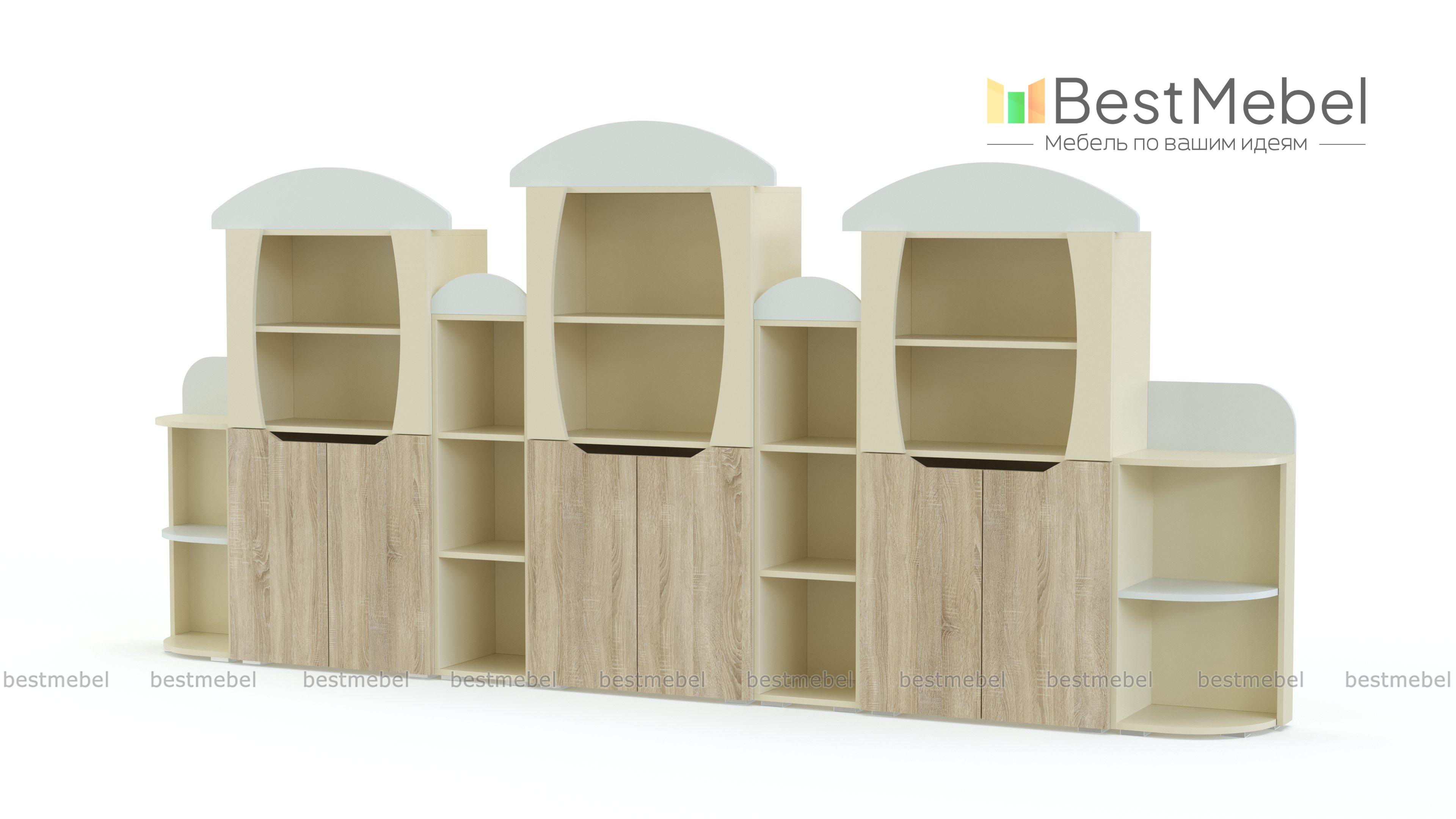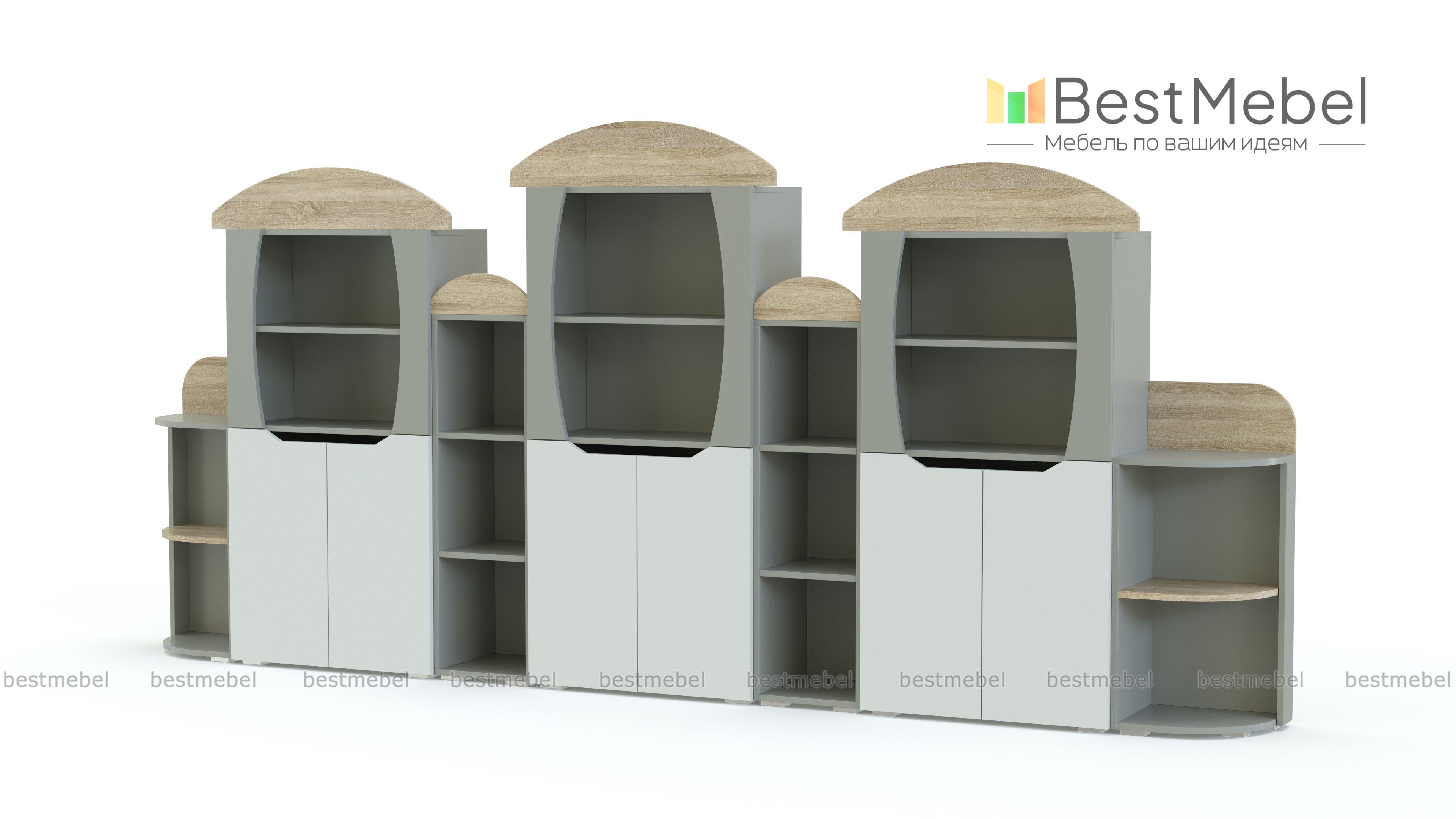 Стеллаж Вираж 4 BMS привлечет внимание детей красочным оформлением и разместит в удобном доступе книги, игрушки и учебные пособия. Стенка с фигурно вырезанными в форме грибков элементами оборудована просторными открытыми полками и тремя двухдверными распашными отделениями с глухими фасадами. Скругленные углы и безопасные ручки-вырезы помогут избежать случайных травм, а залогом долговечности станут износостойкие ламинированные поверхности. Купить стеллаж Вираж 4 BMS для меблировки детского сада вы всегда сможете в нашем интернет-магазине.