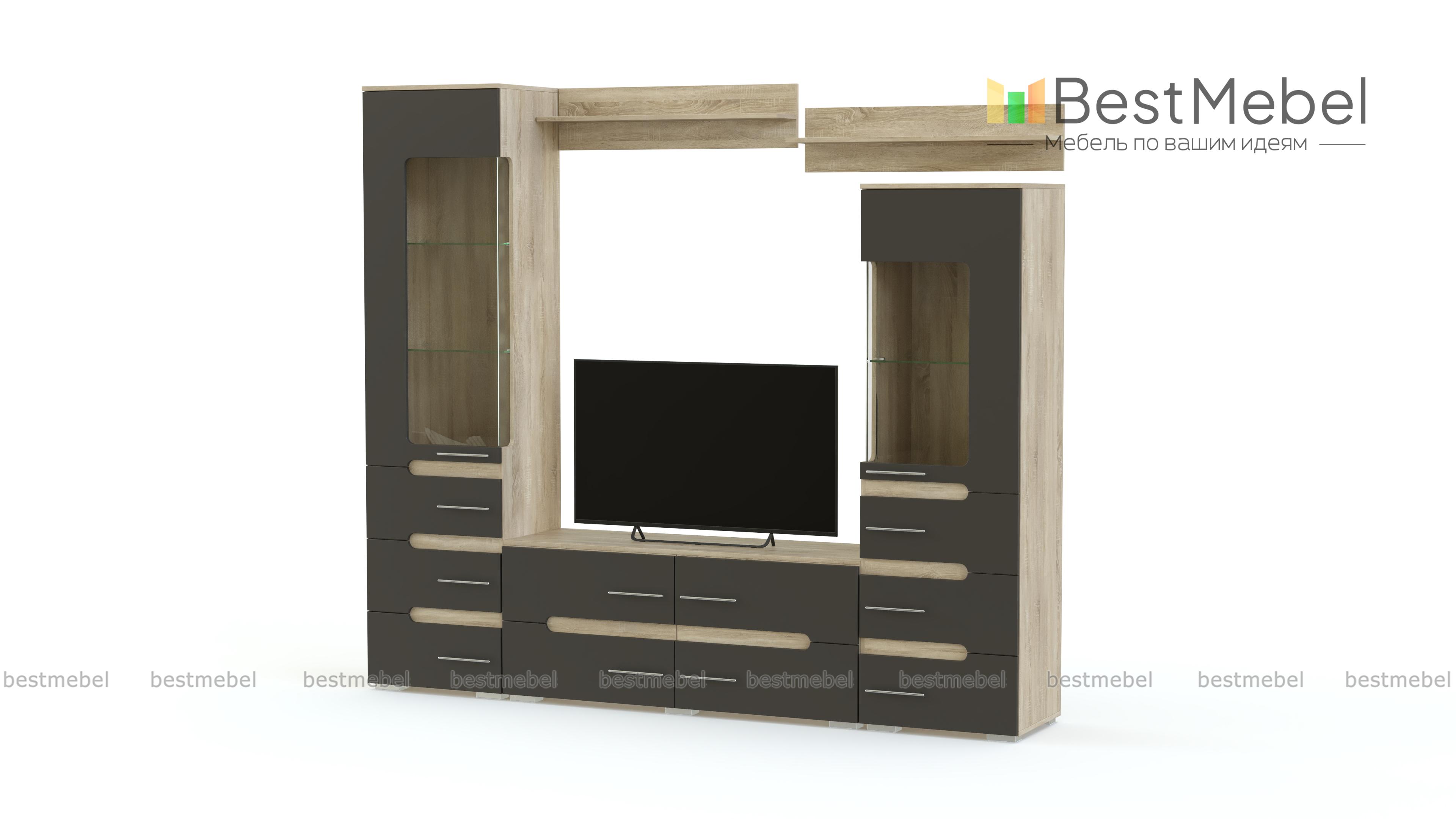 Гостиная Hi-tech 4 BMS представляет собой современный вариант стенки-горки и будет гармонично смотреться в помещениях стиля хай-тек. Яркая и функциональная, гостиная включает в себя две разноуровневые витрины с выдвижными ящиками в основании, тумбу под ТВ и навесные открытые полки. Матовые фасады декорированы контрастными скругленными вырезами и хромированными ручками-рейлингами. Купить гостиную Hi-tech 4 BMS, подобрав оптимальное сочетание из широкой гаммы оттенков для корпуса и фасадов, приглашаем в наш интернет-магазин.