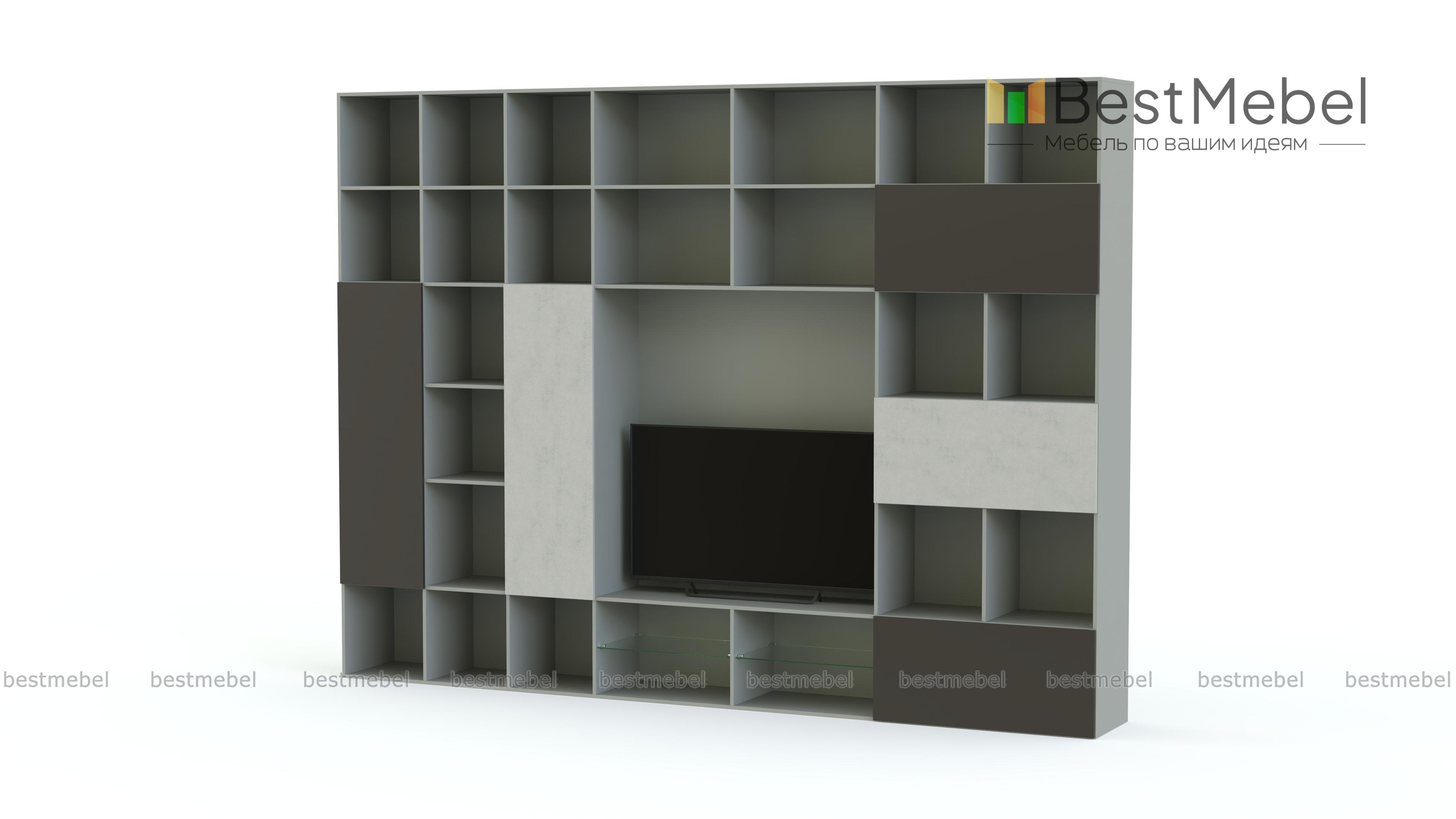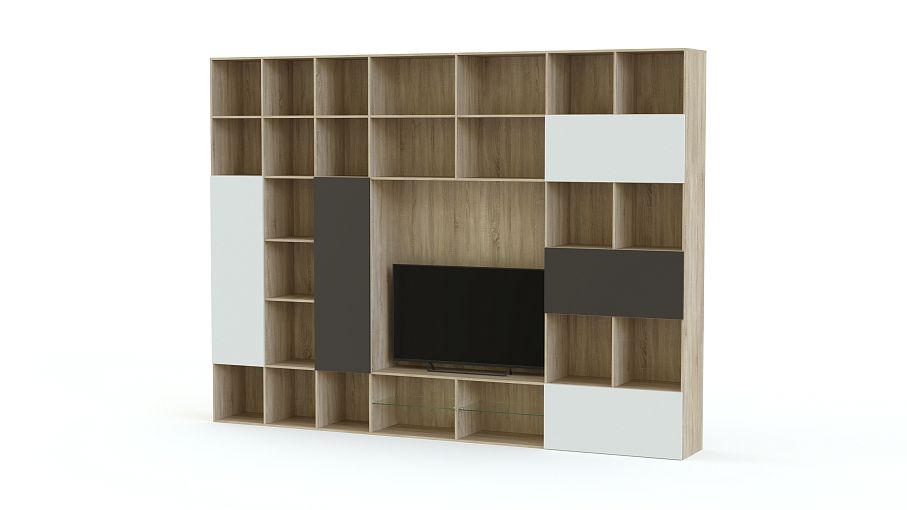 Стенка для гостиной Соло 14 BMS – это современное решение для организации пространства гостиной. Полностью занимающая одну из стен комнаты, композиция представляет собой комбинацию из открытых полок, глухих распашных отделений, тумбы под аудио- и видеоаппаратуру и панели под ТВ. В оформлении яркой стенки гармонично сочетаются нейтральный древесный корпус и графитово-белые контрастные фасады. Купить стенку для гостиной Соло 14 BMS приглашаем в наш интернет-магазин по доступной цене.