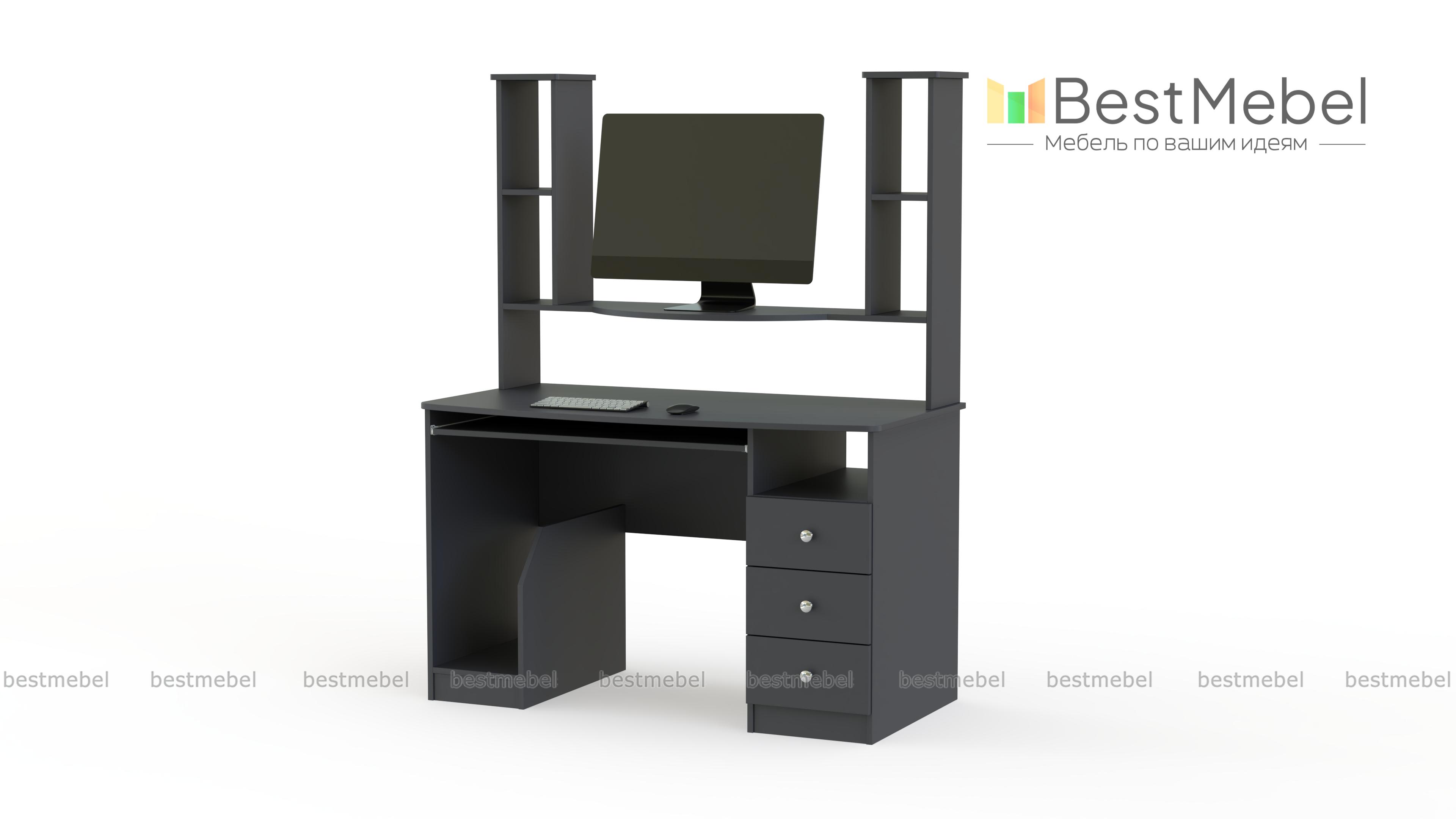СК-001 – идеальный вариант для учащихся и работающих людей. Стол оснащен открытой нишей для системного блока, выдвигающейся панелью для клавиатуры, тремя ящиками для разнообразных документов. Также на столешнице прикреплен стеллаж с множеством полок, где можно разместить предметы декора, сувениры, документы или книги. На сайте Вы можете найти палитру цветов, а также можно подобрать параметры модели. Купить изделие можно в нашем интернет-магазине по доступной цене.