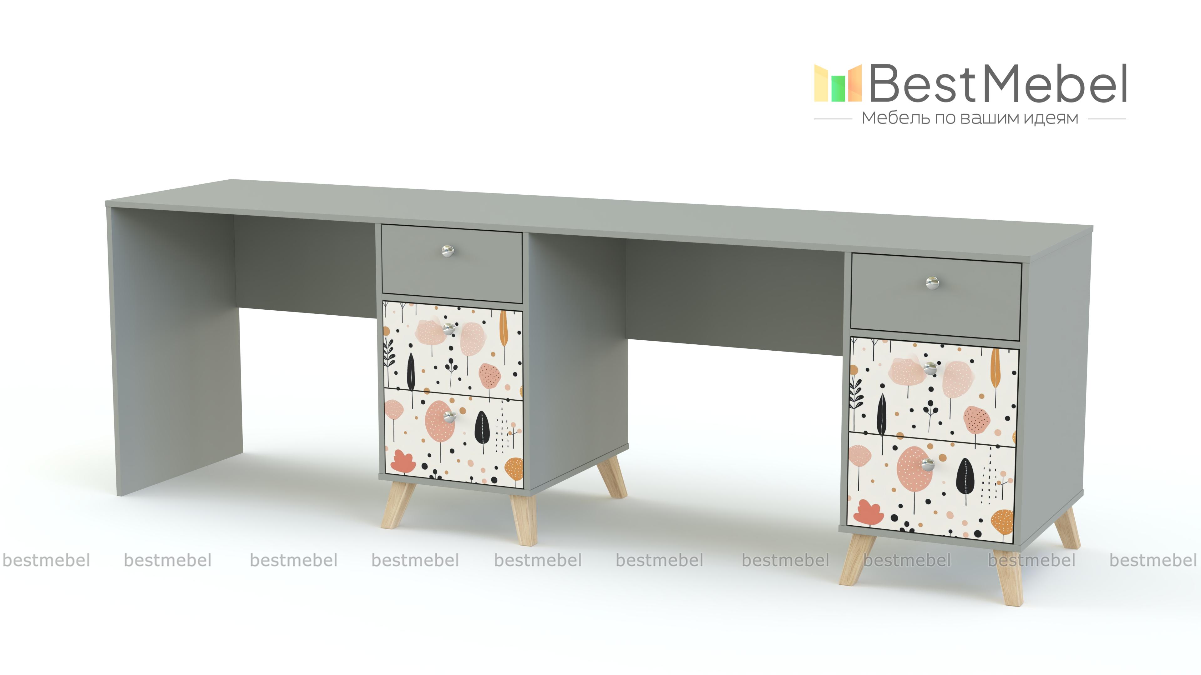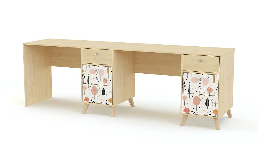 Письменный стол для двоих Эльза 3 BMS обеспечит экономию пространства и комфортное рабочее место каждому ребенку. Удлиненную столешницу разделяют тумбы для хранения канцелярских мелочей и учебников, оснащенные тремя выдвижными ящиками с удобными круглыми ручками. Благодаря сканди-ножкам, теплой нейтральной гамме и стильному принту дизайн стола актуальный и при этом вполне универсальный. Купить письменный стол для двоих Эльза 3 BMS, изготовленный по индивидуальным размерам, вы сможете в нашем интернет-магазине.