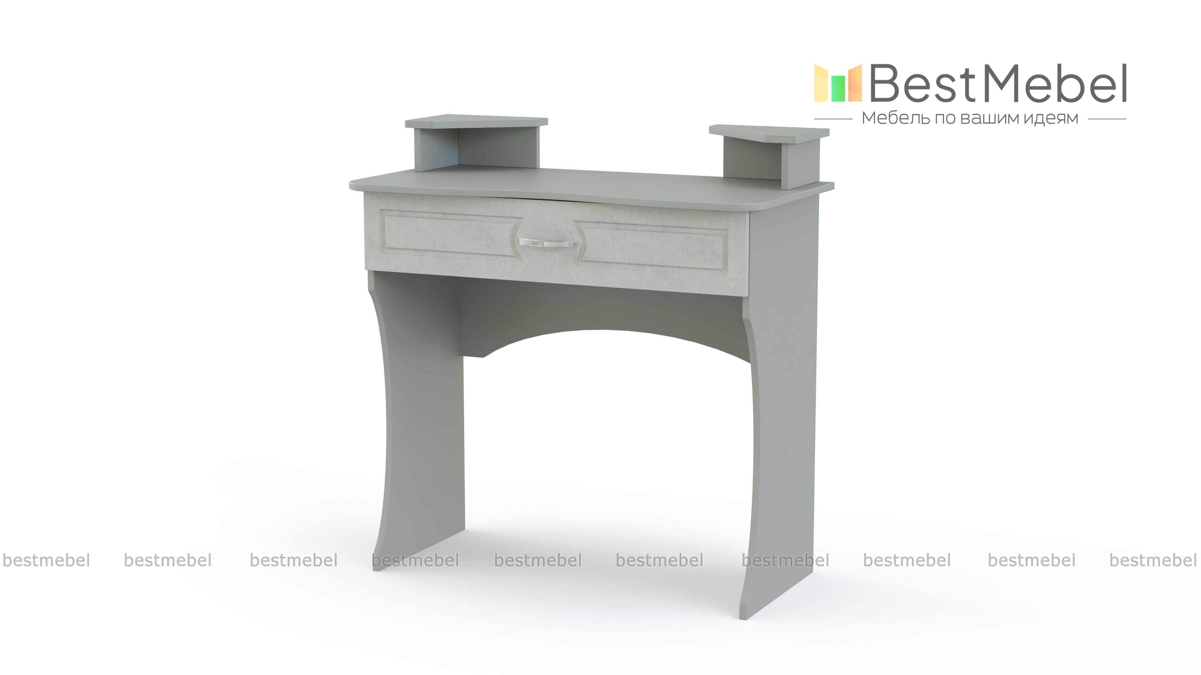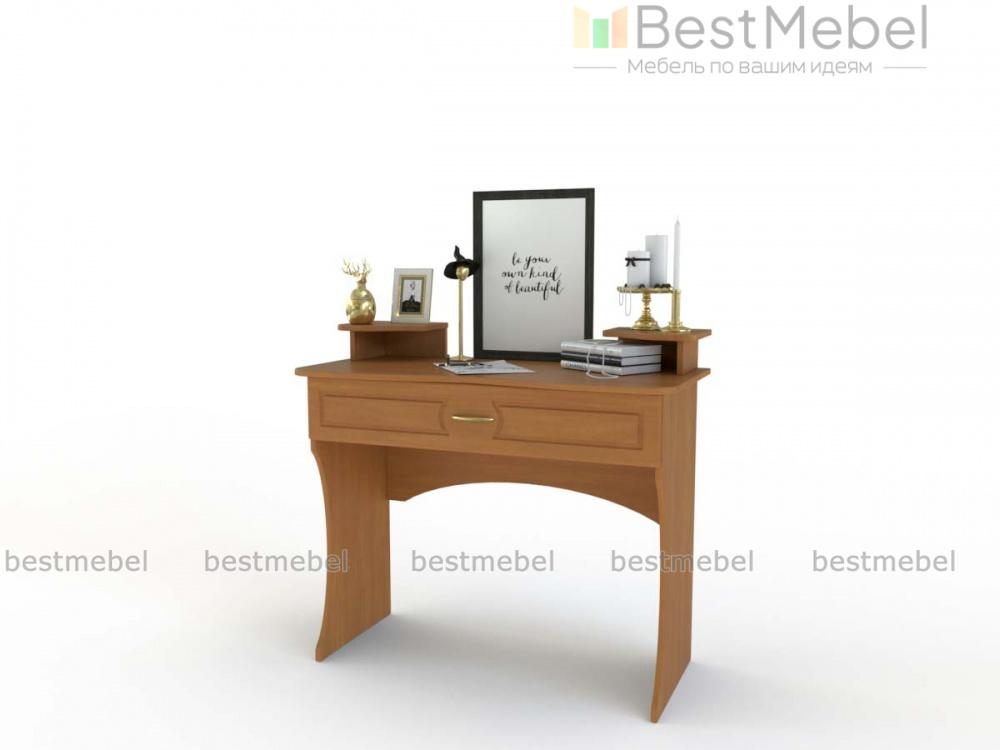 Туалетный столик Афродита 10 BMS выполнен в классическом стиле и гармонично дополнит меблировку элегантной спальни в теплых древесных тонах. Модель с фигурно вырезанными опорами оборудована эргономичной столешницей с вместительным ящиком для мелочей и двумя угловыми надстройками с полочками и нишами. Фасад ящика декорирован неброской фрезеровкой. Купить Туалетный столик Афродита 10 BMS для комфортного ухода за собой вы сможете недорого в нашем интернет-магазине.