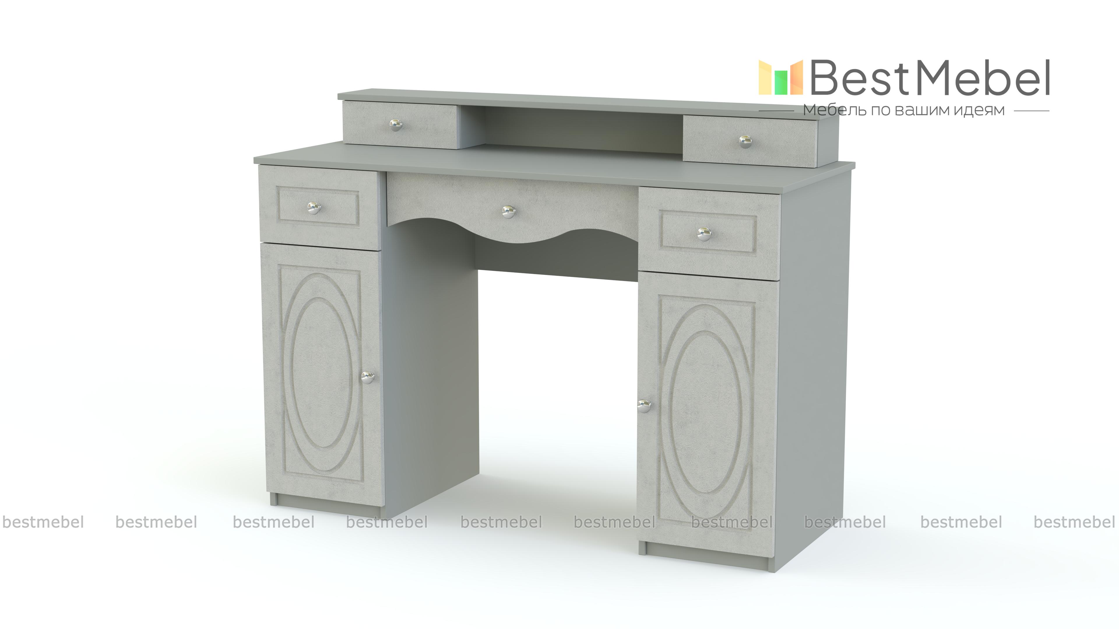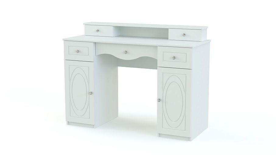 Туалетный столик Лиза 7 BMS станет эффектным дополнением интерьера в стиле модерн или классического. Выполненный в светлых матовых тонах, столик декорирован оригинальной фрезеровкой и изящными ручками-кнопками. Двухтумбовая модель оборудована выдвижными ящиками и распашными отделениями для хранения средств по уходу, на столешнице располагается надстройка с нишей и парой мини-ящиков. Купить туалетный столик Лиза 7 BMS вы сможете в нашем интернет-магазине по лучшей цене.