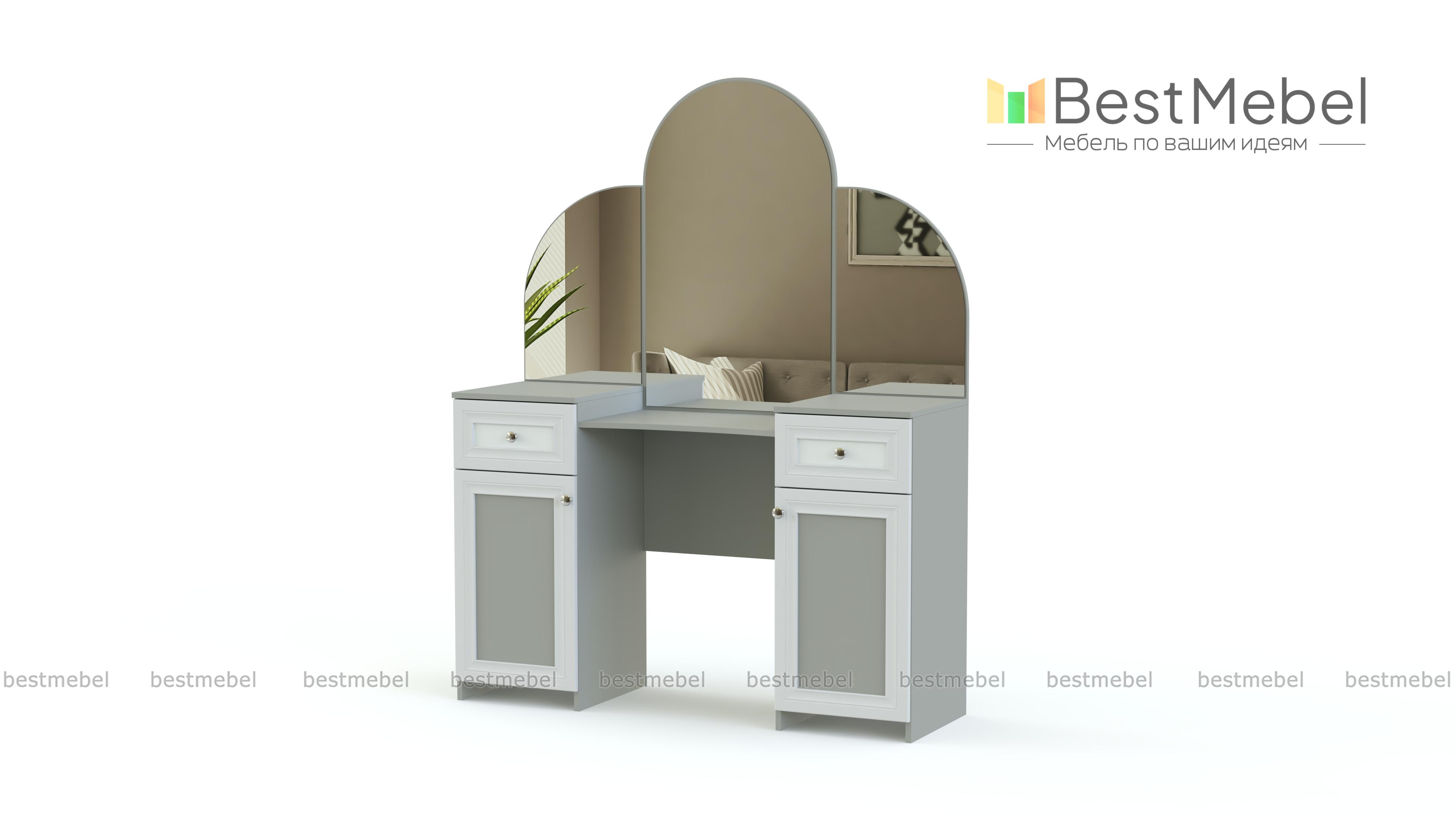Элегантная модель для роскошной спальни в классическом стиле. Необычно декорированное, традиционное трехстворчатое зеркало особенно удобно для создания причесок и макияжа. Косметические средства смогут храниться в выдвижных ящиках боковых тумб или на полках за распашными дверцами. Благодаря насыщенным естественным цветам, изящному декору и неброской матовой золотистой фурнитуре туалетный столик Типони 2 BMS прекрасно впишется в интерьер и создаст в вашей комнате атмосферу уюта.