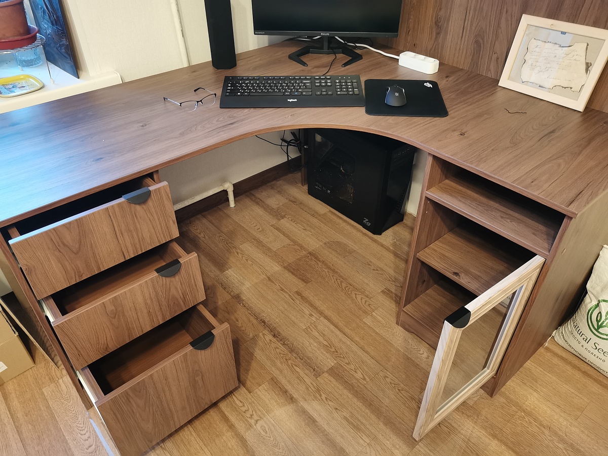 Приобрела стол данной модели в конце ноября 2025 года (заказ № 00000321456).Заказ делала в одном из офисов BestMebel, так как боялась ошибиться или просчитаться с размерами и конфигурацией сама через сайт - мне не была нужна приставная тумба, но нужны были ящики и тумба под единой цельной столешницей по моим размерам, плюс мне было важно живьем увидеть цвета и материалы. Эскиз мне составили быстро и четко по моим пожеланиям, менеджер была грамотна и терпелива (конечно же у меня были муки выбора цвета, ручек, фурнитуры, как без этого!).Отдельный респект за то, что перед запуском в производство вам направляют по почте на согласование технический чертёж с размерами, который получился по итогам составленного при заказе эскиза, и на этом этапе можно что-то поправить. В этом плане опасения насчет дальнейших самостоятельных заказов через сайт отпали.Производство и доставка были осуществлены без задержек, в обозначенные изначально сроки. Доставка порадовала аккуратностью, все было цело-невредимо, а еще человеческим согласованием времени доставки, что для работающего человека вот реально важно.Сборкой занималась сама, и для этого к доставленному товару прилагается очень удобная схема (не та, что распечатанная, а та, что по qr-коду на распечатке). Все доставленные вам детали пронумерованы, и каждую из деталей вы можете по номеру найти на интерактивной схеме и увидеть, как и где она должна быть расположена. Короче рукодельники получат от сборки отдельное удовольствие! Все необходимые отверстия уже просверлены, все необходимые крепежи в нужном количестве (и даже с небольшим запасом) приложены. Собранный стол полностью соответствует моим ожиданиям, качество материалов порадовало (первые пару дней был запах дерева в комнате, но никаких химических запахов), при сборке проблем (типа кривого распила) не возникло. Рекомендую!